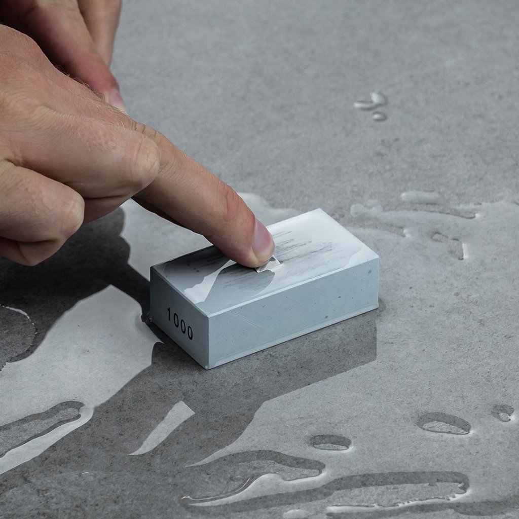 Základní brusný kámen velikosti 65 × 34 × 20 mm, se kterým naostříte menší dláta a nože. Při ostření stačí malé množství vody.