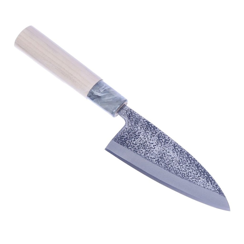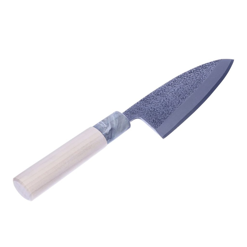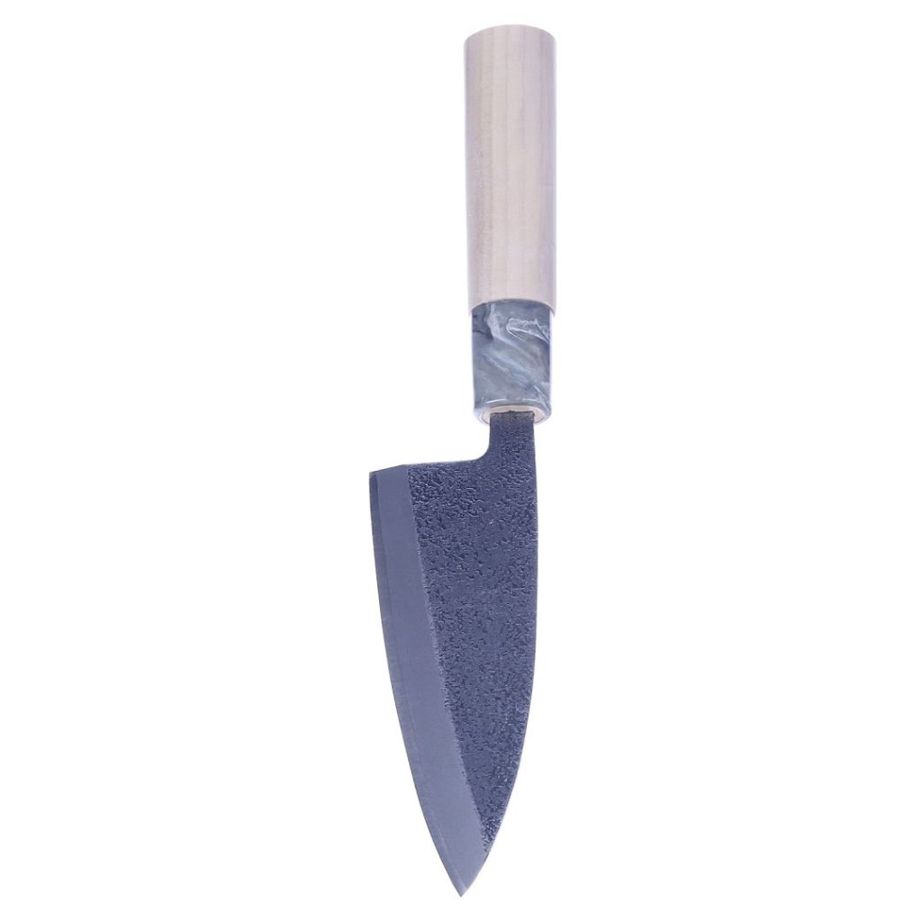 Deba nůž od UMEBACHI RYUMA, s jeho charakteristickým kladívkovým povrchem a 120 mm dlouhou čepelí, představuje dokonalou kombinaci tradičního řemesla z Banshu Miki a inovativní technologie. Navržen pro precizní filetování malých ryb, jako jsou makrely a červené kanice. Jeho kompaktní velikost zajišťuje snadnou manipulaci. Používejte tento nůž pouze k jeho určenému účelu a vyhýbejte se řezání tvrdých nebo zmrazených materiálů, aby byla zachována integrita čepele.