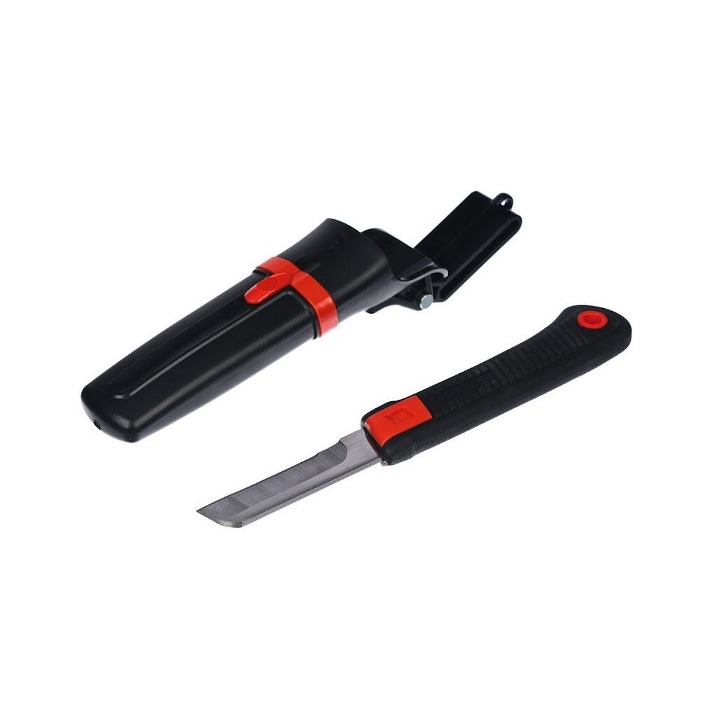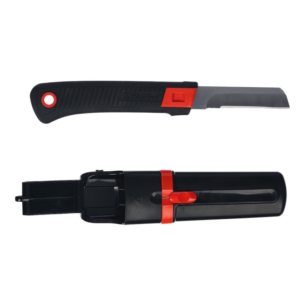 Pracovní a elektrikářský nůž MIRAI, model DM-1B, je navržen pro snadné a efektivní odizolování kabelů. Tento nůž s protiskluzovou gumovou rukojetí zajišťuje bezpečné a pohodlné držení. Čepel je vyrobena z vysoce kvalitní speciální oceli, která poskytuje vynikající ostrost. Integrovaný držák na opasek umožňuje snadný přístup k noži, a plastové pouzdro je odolné a nárazuvzdorné, vybavené mechanismem pro uzamčení a zvýšení bezpečnosti.