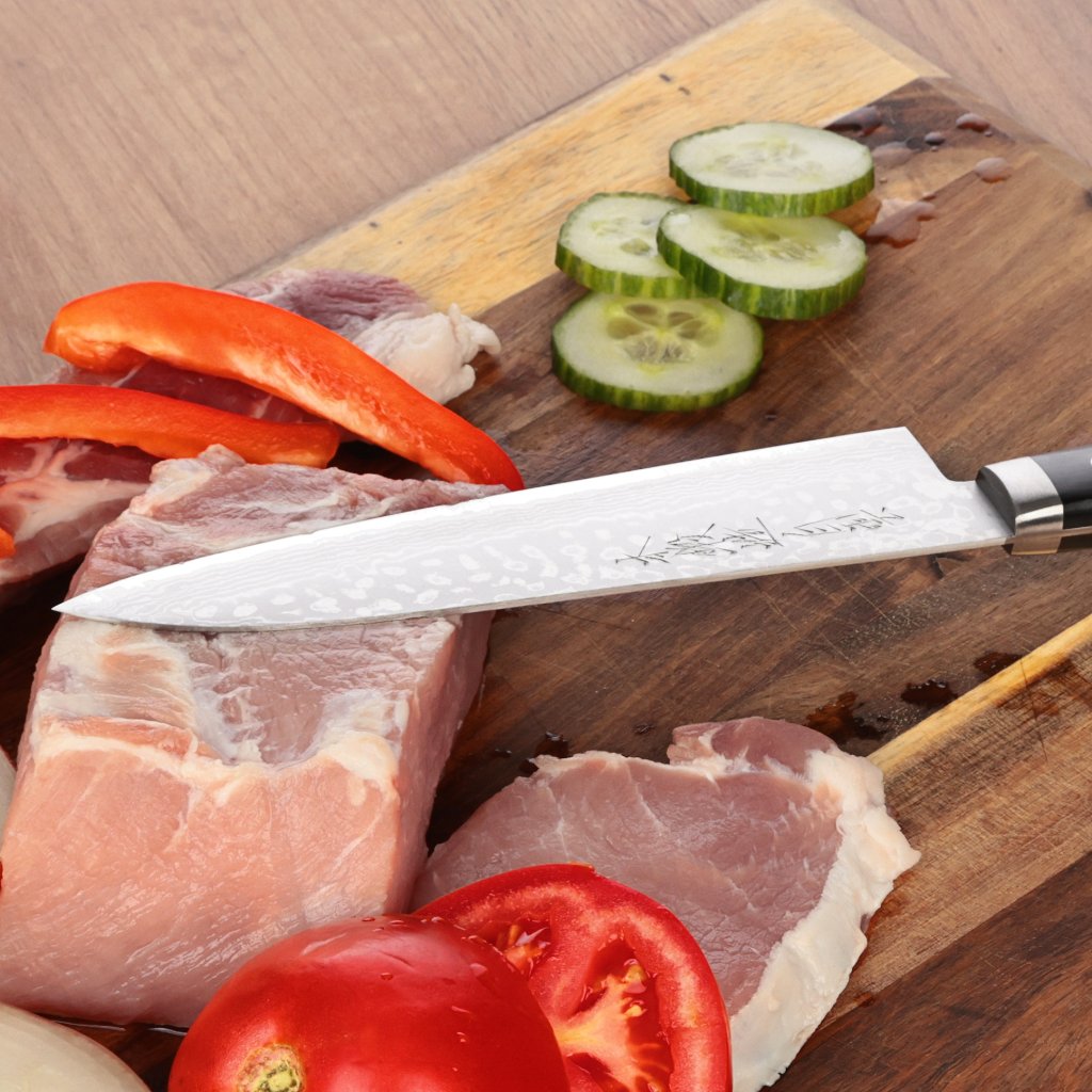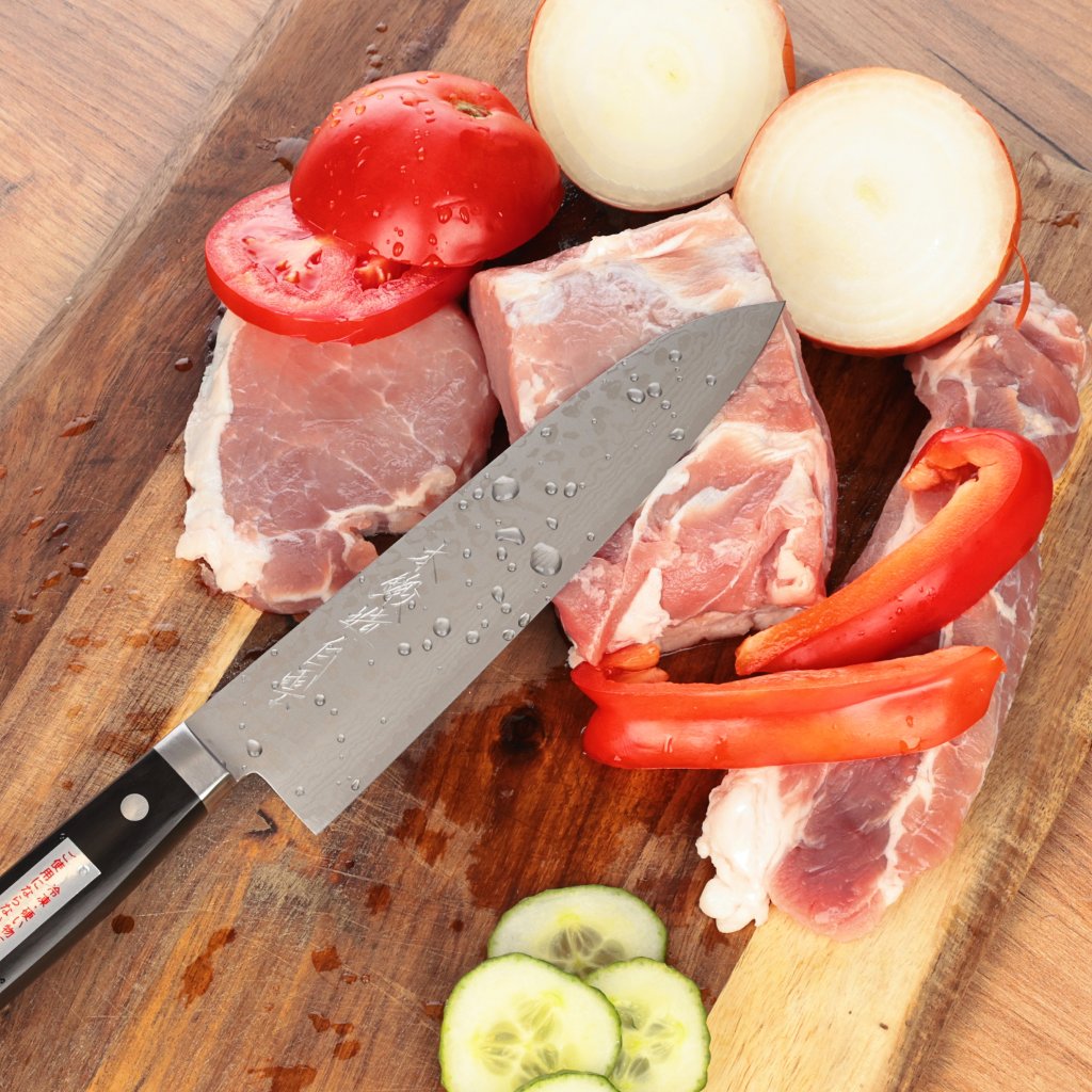 Ručně kovaný kuchyňský nůž MIKI HAMONO SEISAKUSHO je výjimečným nástrojem navrženým pro profesionální kuchaře a kulinářské nadšence. Tento Gyuto nůž je vyroben z VG10 nerezové oceli, která je známá svou odolností proti korozi a trvanlivostí. Má unikátní 35-vrstvou laminovanou ocelovou konstrukci na každé straně, která poskytuje pevnost a krásný damaškový vzor. 180 mm dlouhá čepel je ideální pro různé kuchyňské úkoly.