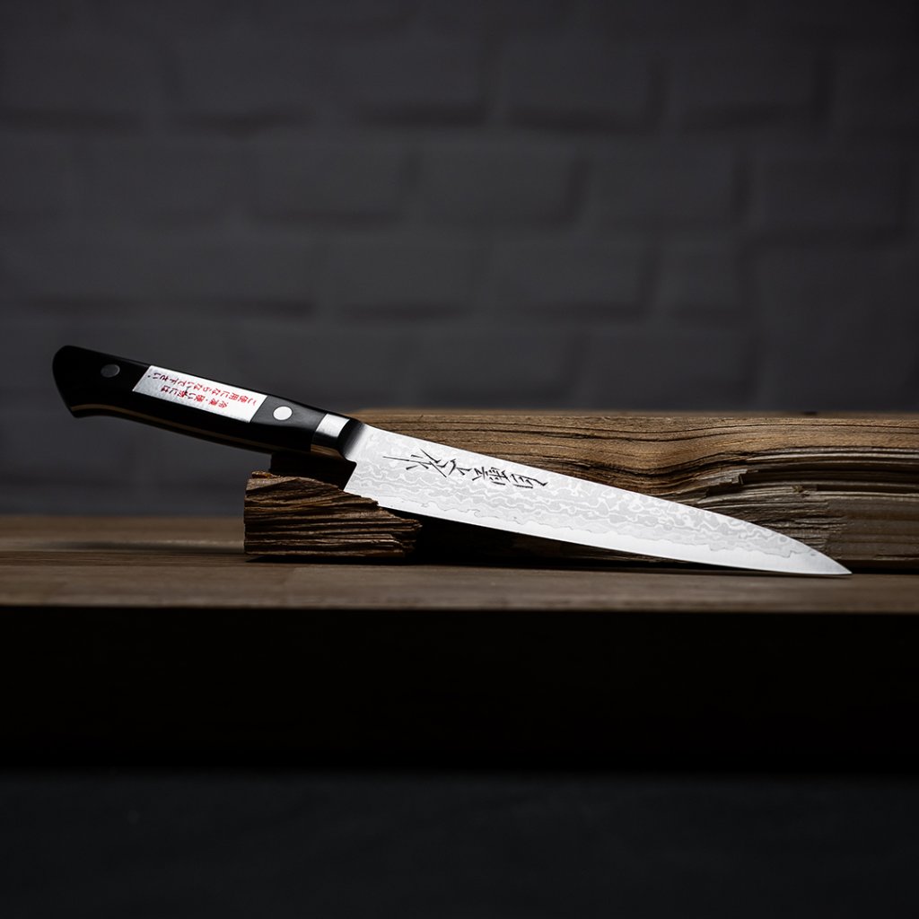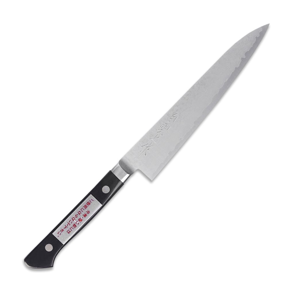 Představujeme nůž Miki Hamano Seisakusho základní nástroj v japonských kuchyních. Tento univerzální nůž je navržen pro snadné krájení, sekání a mletí nadrobno, což ho činí ideálním pro přípravu masa, zeleniny a ryb. Jeho 150 mm dlouhá čepel je vyrobena z vysoce čisté nerezové oceli (VG10) obklopené vrstvami měkké nerezové oceli, což vede k rezistentní a odolné hraně. Každý nůž je ručně kovaný zkušenými řemeslníky, a to mu dává výrazný a hluboce texturovaný povrch.