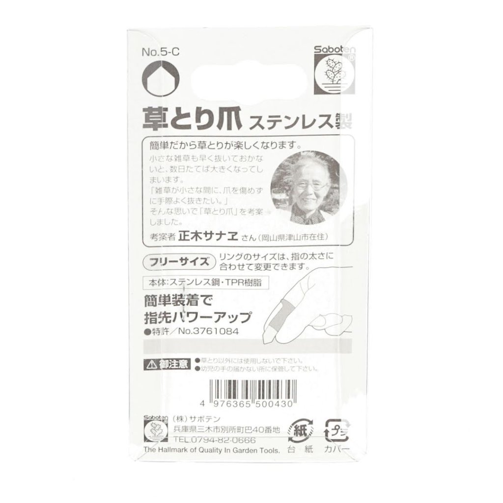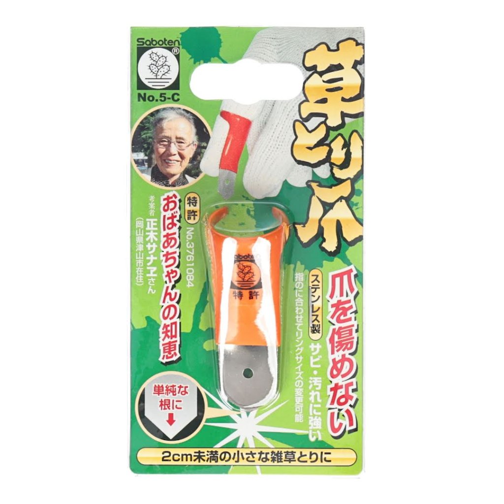Vytrhávač plevele SABOTEN, model No.5-C, je inovativní zahradní nástroj navržený pro přesné pletí. Ideální pro odstranění malých plevelů pod 2 cm. Tento pleč se vyznačuje unikátním tvarem s jedním zubem, který efektivně zvedá jednoduché kořeny, aniž by je poškodil. Nastavitelný kroužek zajišťuje pevné uchycení na prstu, čímž zlepšuje kontrolu a pohodlí při používání. Vyroben z nerezové oceli, nabízí vynikající odolnost proti korozi a nečistotám.
