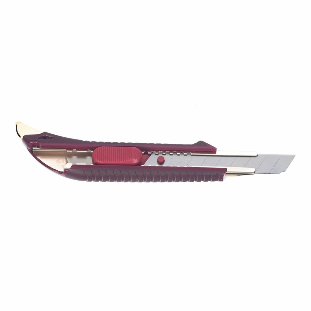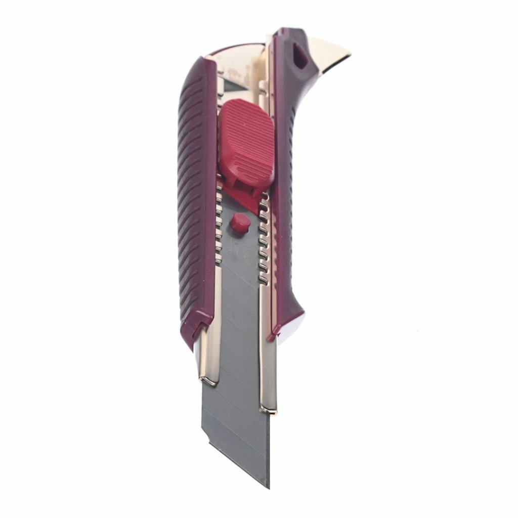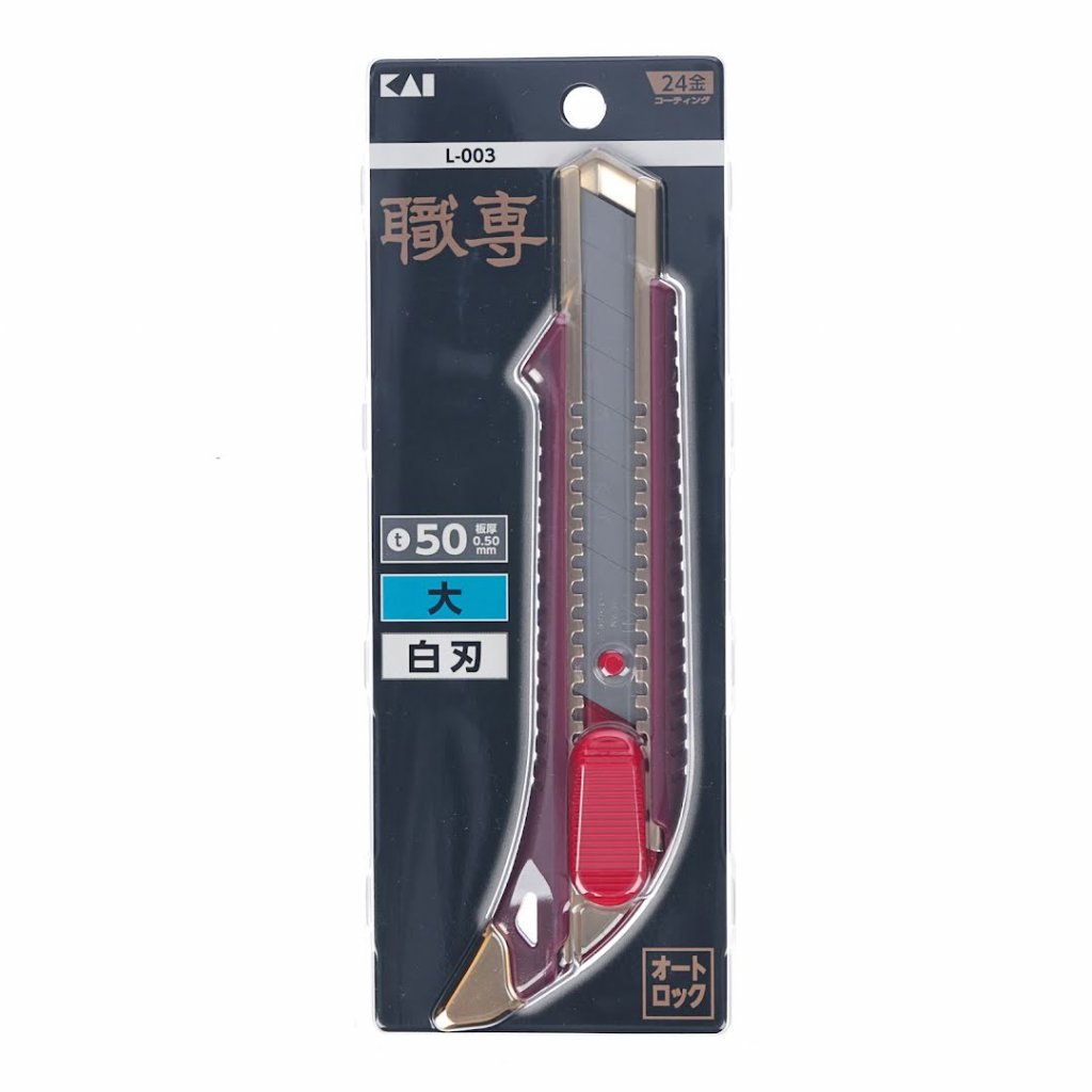 Japonský odlamovací nůž KAI, L-003, je navržen pro přesnost a odolnost při interiérových, podlahových a elektroinstalačních pracích. Jeho ergonomicky navržená tvrdá gumová rukojeť pohodlně padne do ruky, což zvyšuje efektivitu práce spolu s hladkým automatickým zámkem posuvníku pro rychlé a bezpečné nastavení čepele. S důrazem na odolnost nabízí temperované kovové vedení a kovový dráp s prémiovým matně zlatým povrchem, což zajišťuje viditelnost a dlouhou životnost. Automatický zámek posuvníku nože může vydržet tlak až 40 kg, což jej činí vhodným jak pro tlačné, tak i tažné řezání.