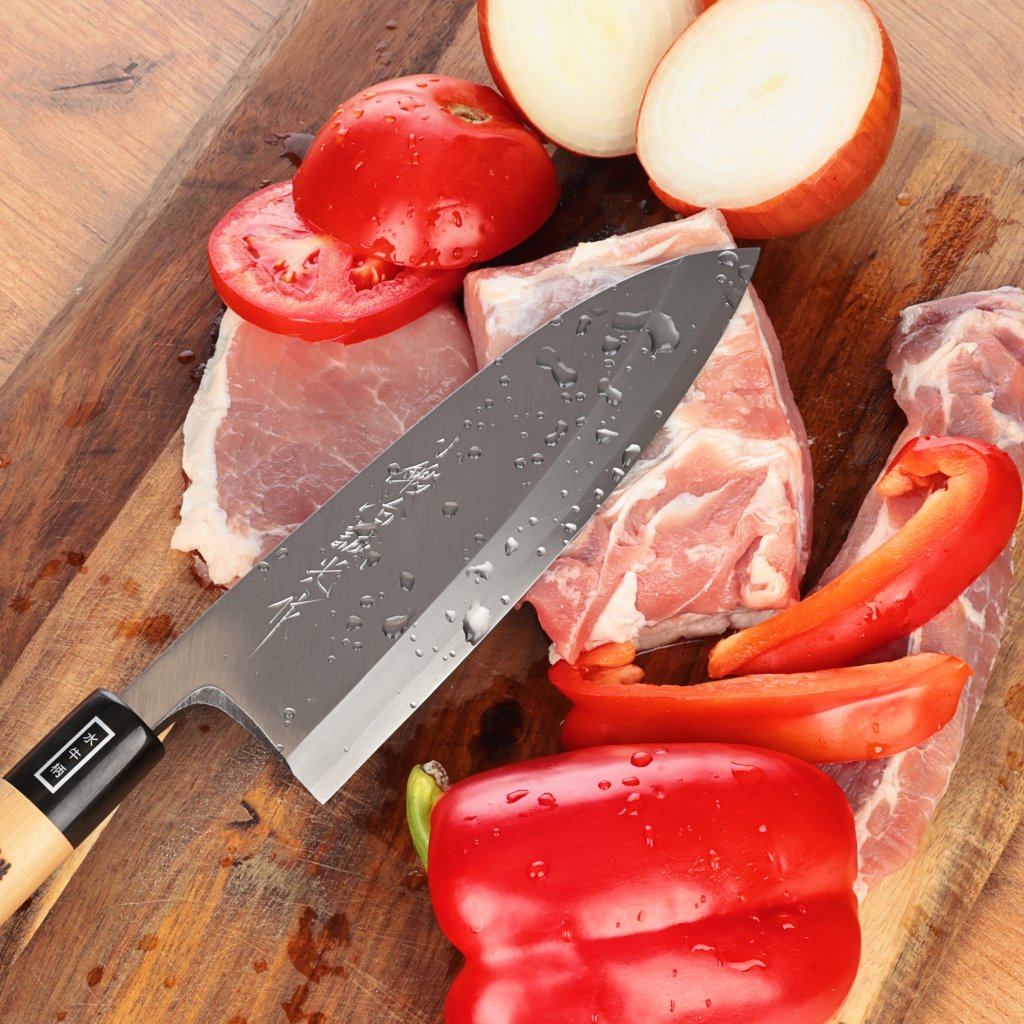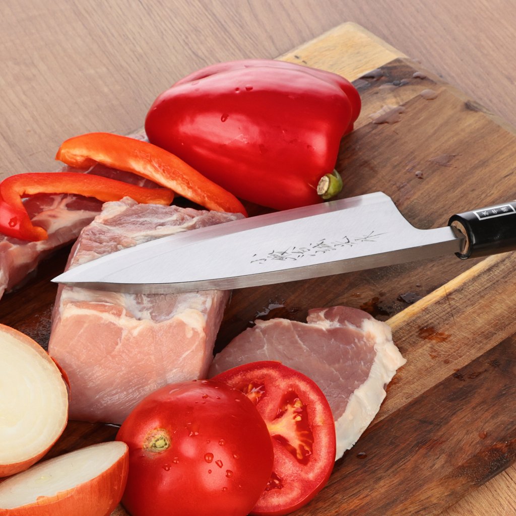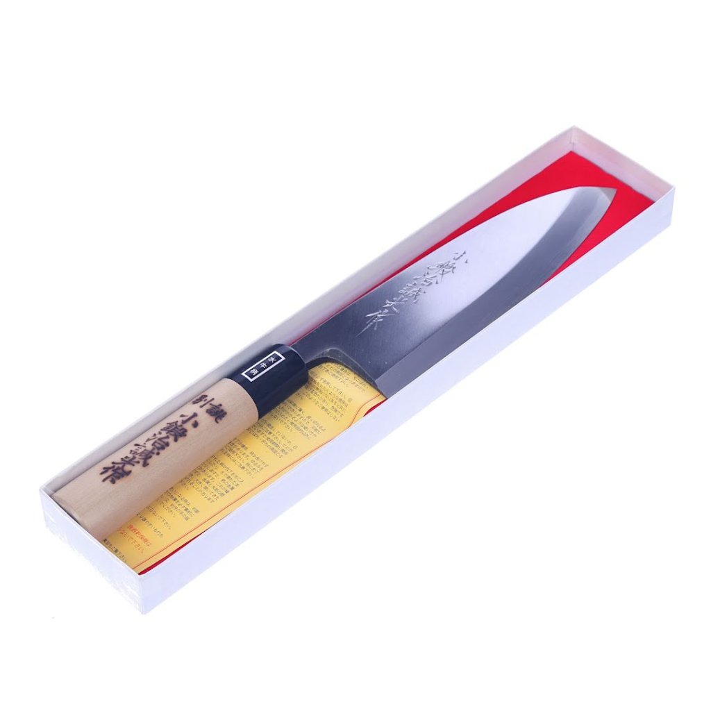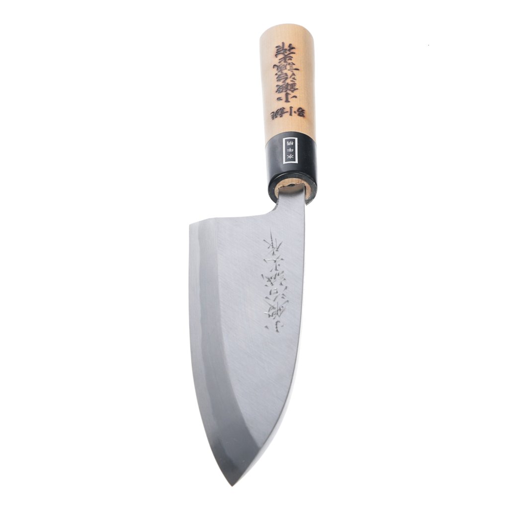 Nůž MIKI HAMONO SEISAKUSHO na filetování ryb je pečlivě zpracovaný nástroj určený pro profesionální kuchaře. Jeho čepel je kovaná z vysoce kvalitní oceli a železa, přičemž jsou použity tradiční techniky k zajištění odolnosti a flexibility. S délkou čepele 180 mm a hmotností 380 g je tento robustní nůž ideální pro vykonávání úkolů jako je filetování na tři kusy, škrábání šupin a řezání kostí. Jeho jednostranný design umožňuje čisté, rovné řezy bez ohýbání nebo deformace pod tlakem.