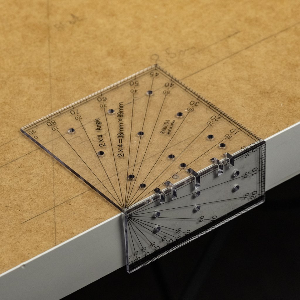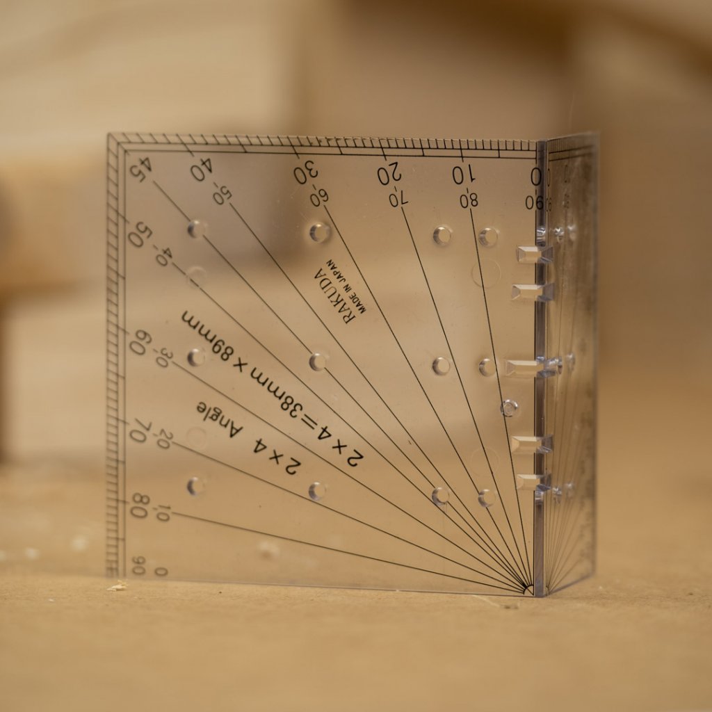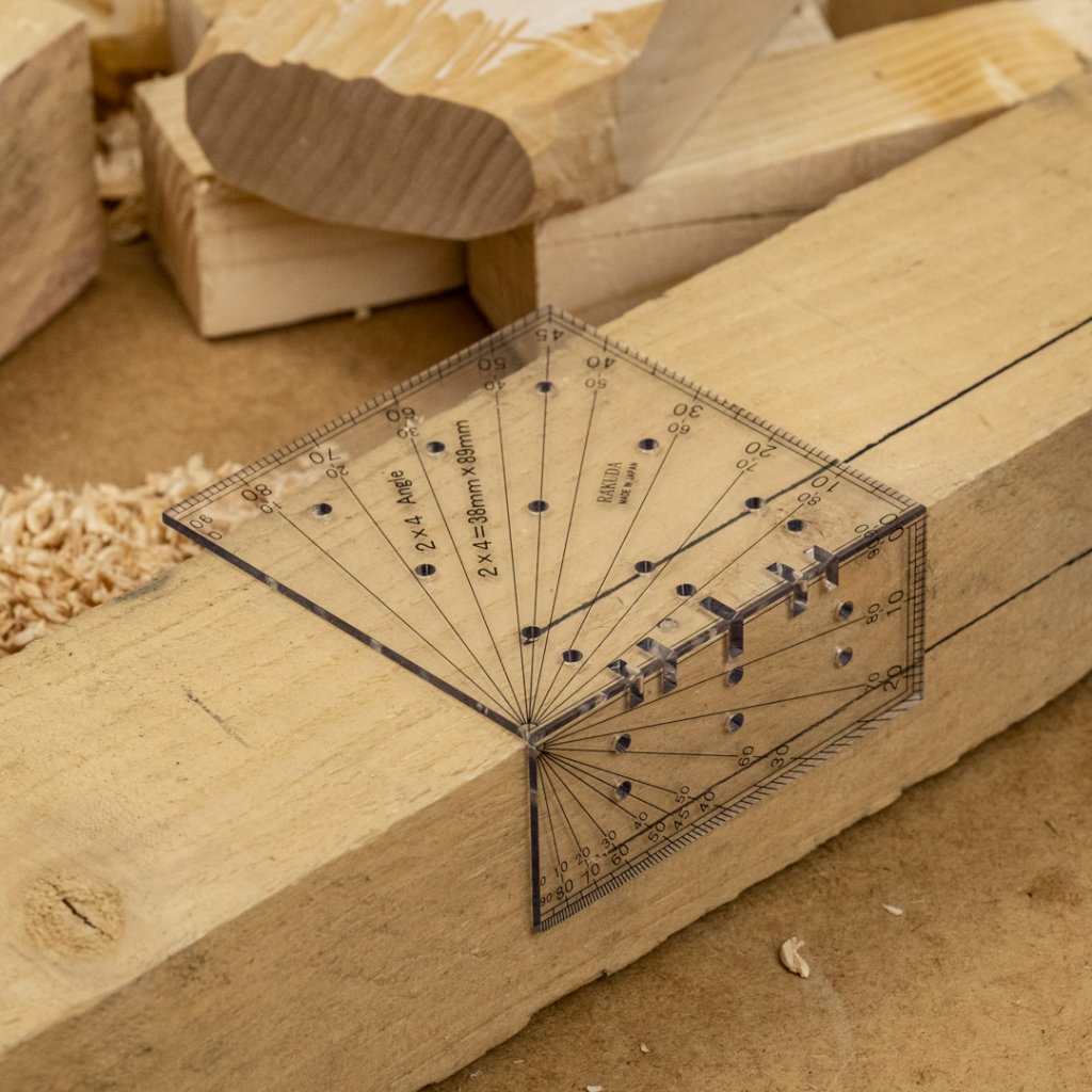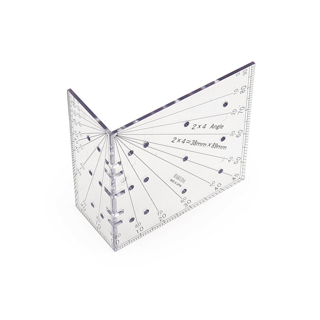 Japonský průhledný rohový značící úhloměr se stupnicí 0 až 90°. Perokresba pro řezání pilou a bodování pro hřebíky a šrouby. Pravítko je uzpůsobeno šířce a tloušťce řeziva 2x4 (38x89 mm). Vytyčení 45 stupňů pro řezání pilou, vytyčení středu každé plochy řeziva 2x4 a 1x4, vytyčení polohy materiálu pro kostru řeziva a polic. Vytyčení dvoudílných, třídílných a čtyřdílných spojů.