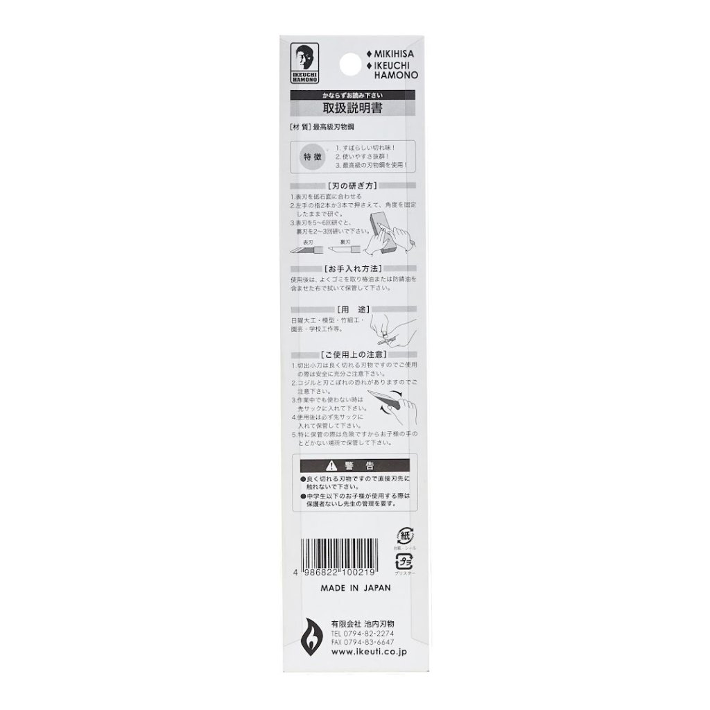 MIKIHISA Kiridashi Kogatana nůž dokonale spojuje tradici a moderní technologii z proslulého dědictví výroby čepelí Banshu Miki. Tento nůž je navržen pro různé použití, jako je řezbářské řemeslo práci z bambusem nebo modelářství. Tyto nože Kogatana lze používat buď holé, nebo s potahem z bambusu či kůže, jak je japonskou tradicí. Můžete si k nim také vyrobit dřevěnou rukojeť. K ostření kogatany doporučujeme japonské vodní kameny.