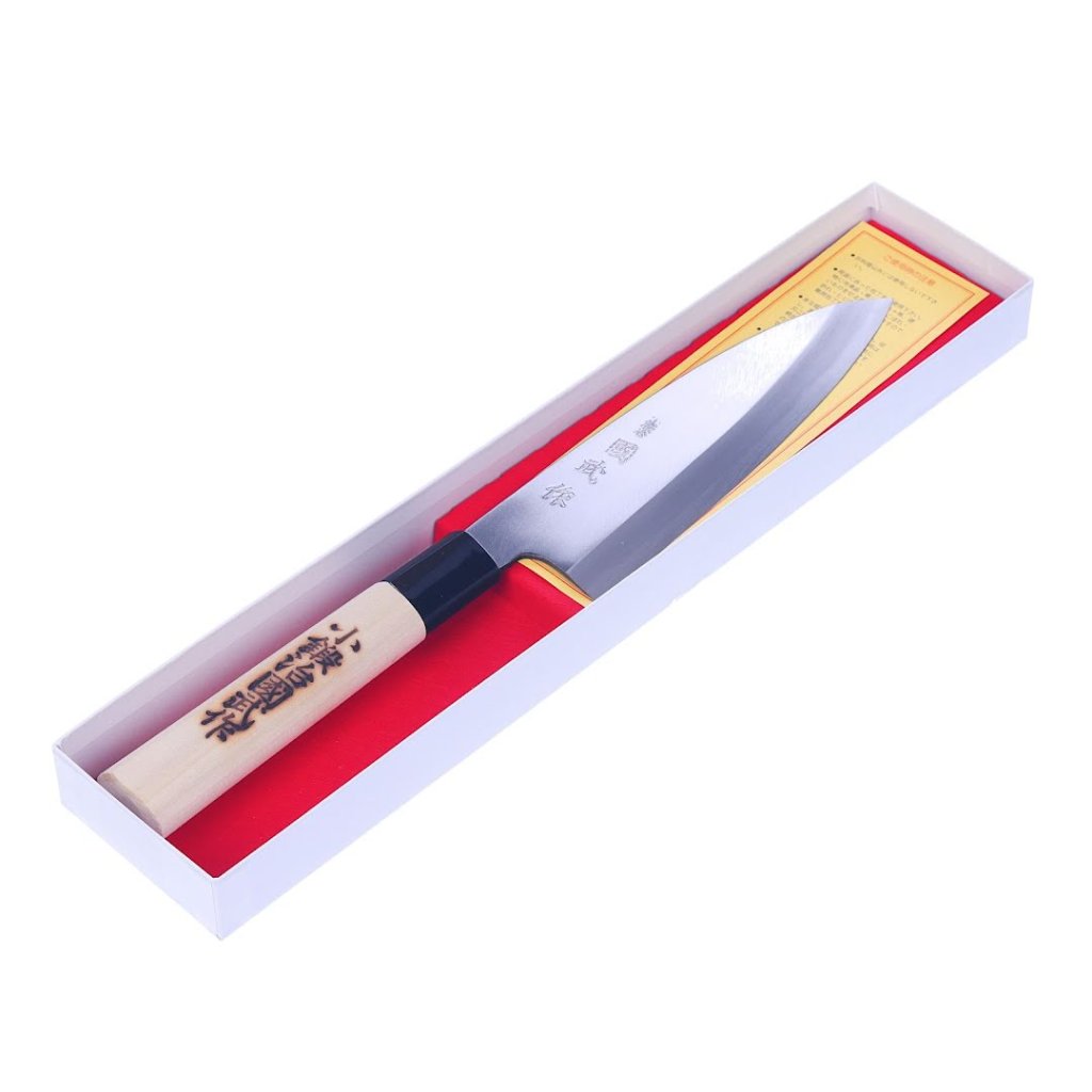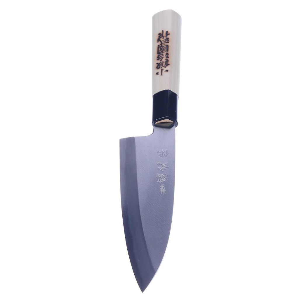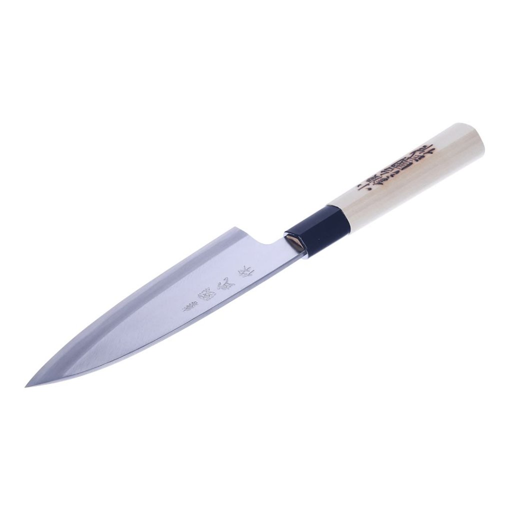 Kuchyňský nůž MIKI HAMONO SEISAKUSHO je univerzální kuchyňský nástroj navržený pro různé úkoly. S délkou čepele 165 mm a jednostranným ostřím je tento nůž ideální pro krájení ryb, masa a zeleniny. Díky speciální oceli čepele tento nůž poskytuje odolnost a ostrost a je určen pro domácí i profesionální použití. Používejte jej s opatrností kvůli vysoké ostrosti čepele.