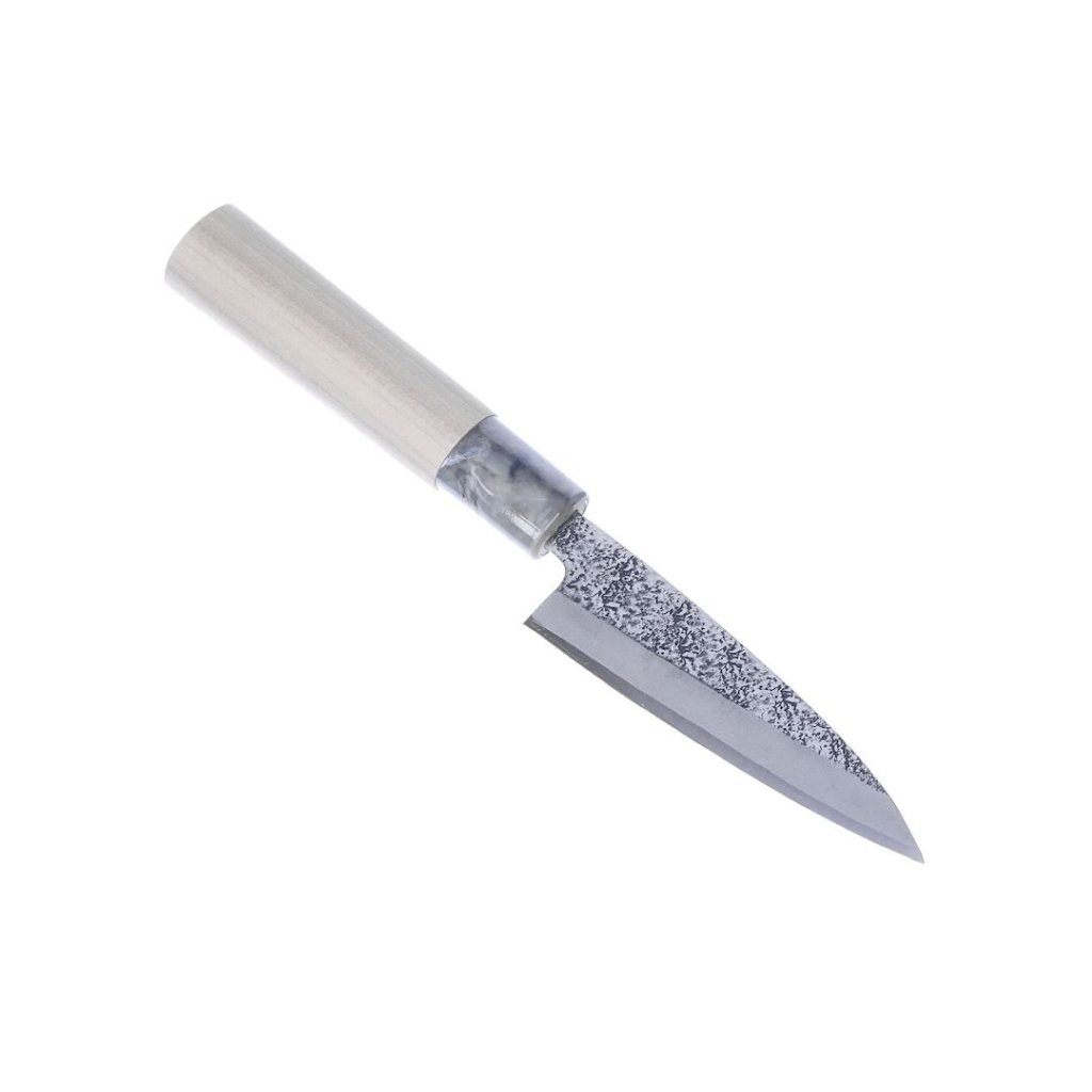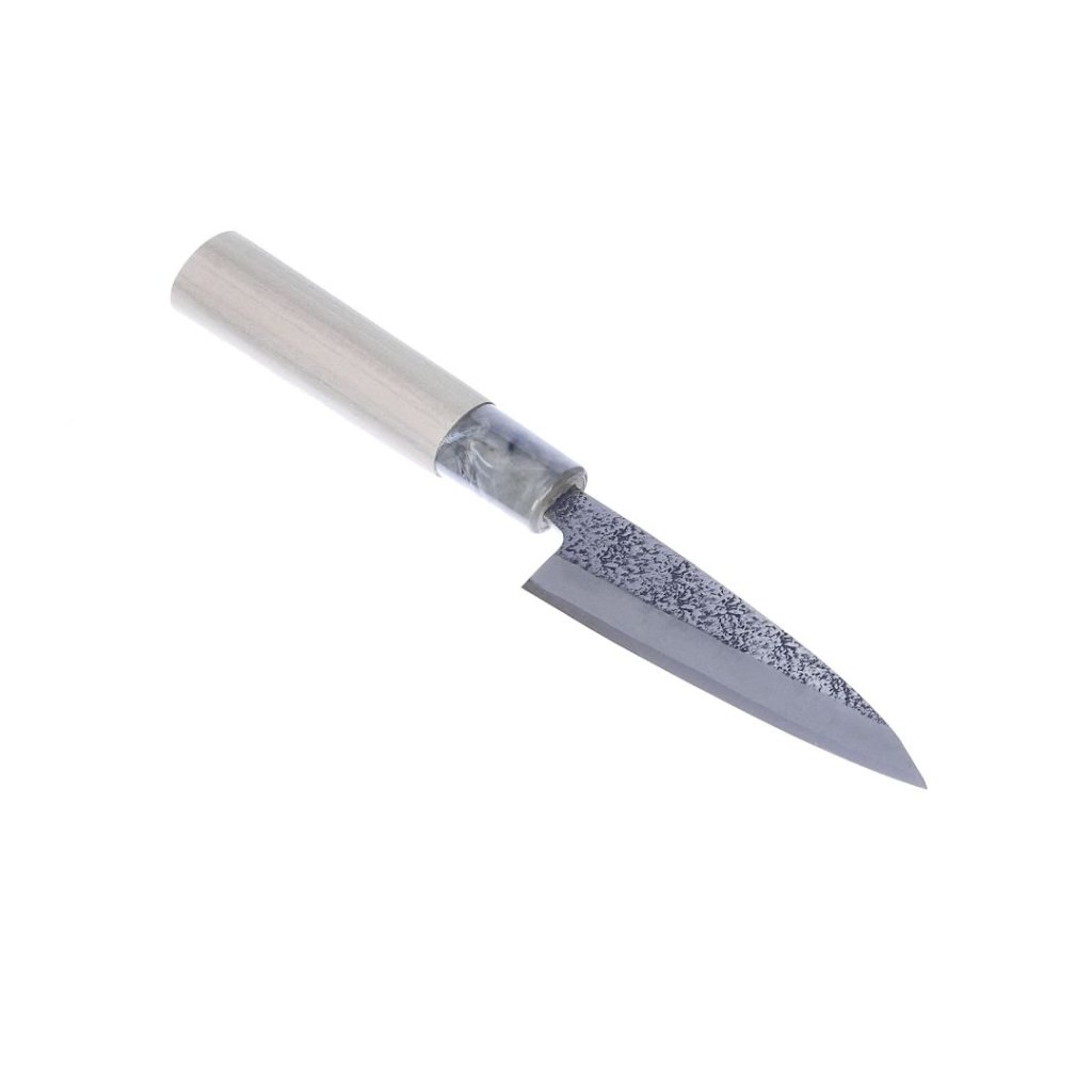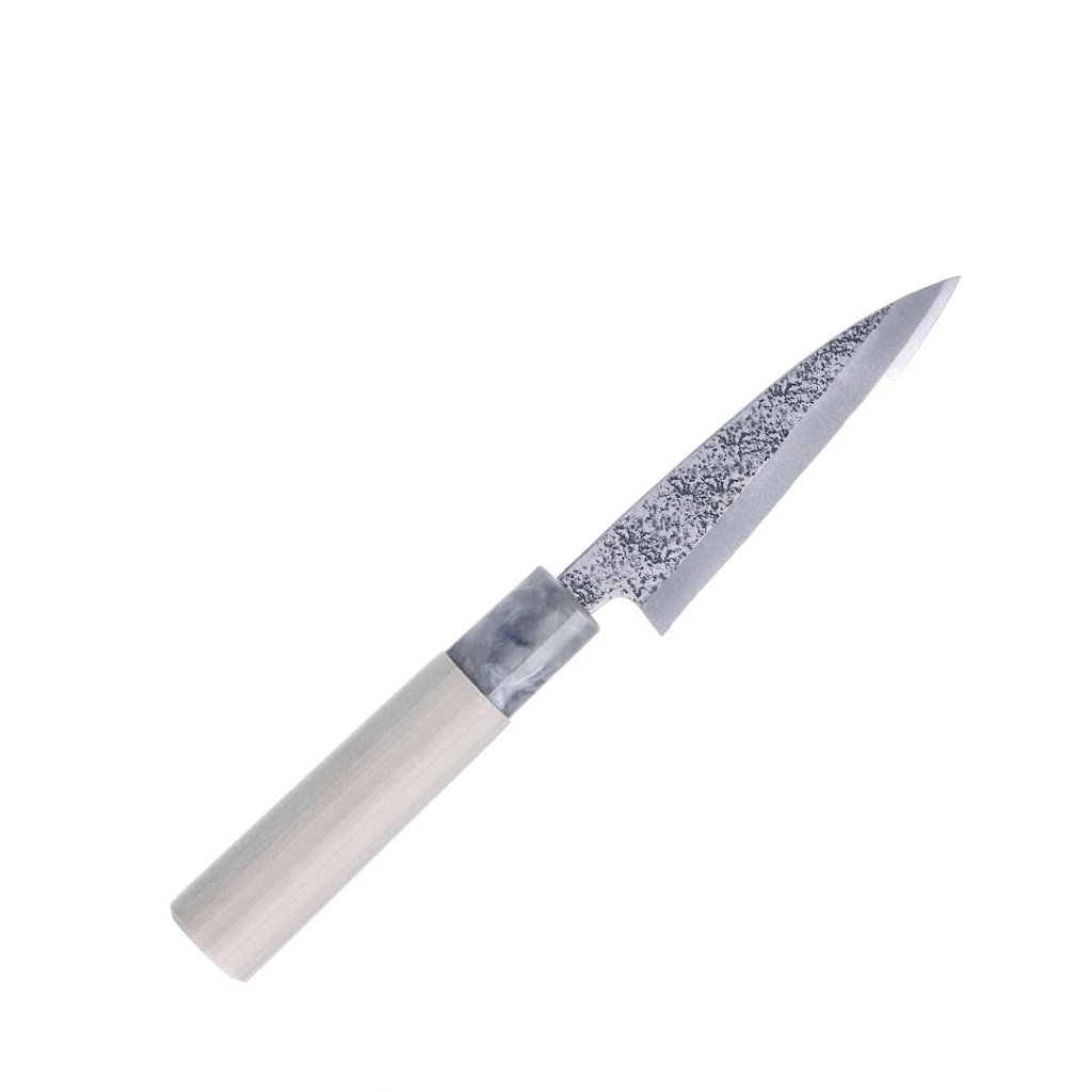 UMEBACHI RYUMA víceúčelový kuchyňský nůž s charakteristickou kladívkovou úpravou a délkou čepele 105 mm je spojením tradičního řemesla a inovativní technologie kovaných čepelí Banshu Miki, navržených pro odolnost, flexibilitu a dlouhotrvající ostrost. Tento všestranný nůž je ideální pro různé kuchyňské úkoly, od jemného krájení malých ryb, jako je makrela, až po jemné sekání, což z něj činí cenný nástroj pro domácí i venkovní použití. Pro dlouhou životnost je důležité po každém použití nůž ošetřit olejem, aby se předešlo korozi.