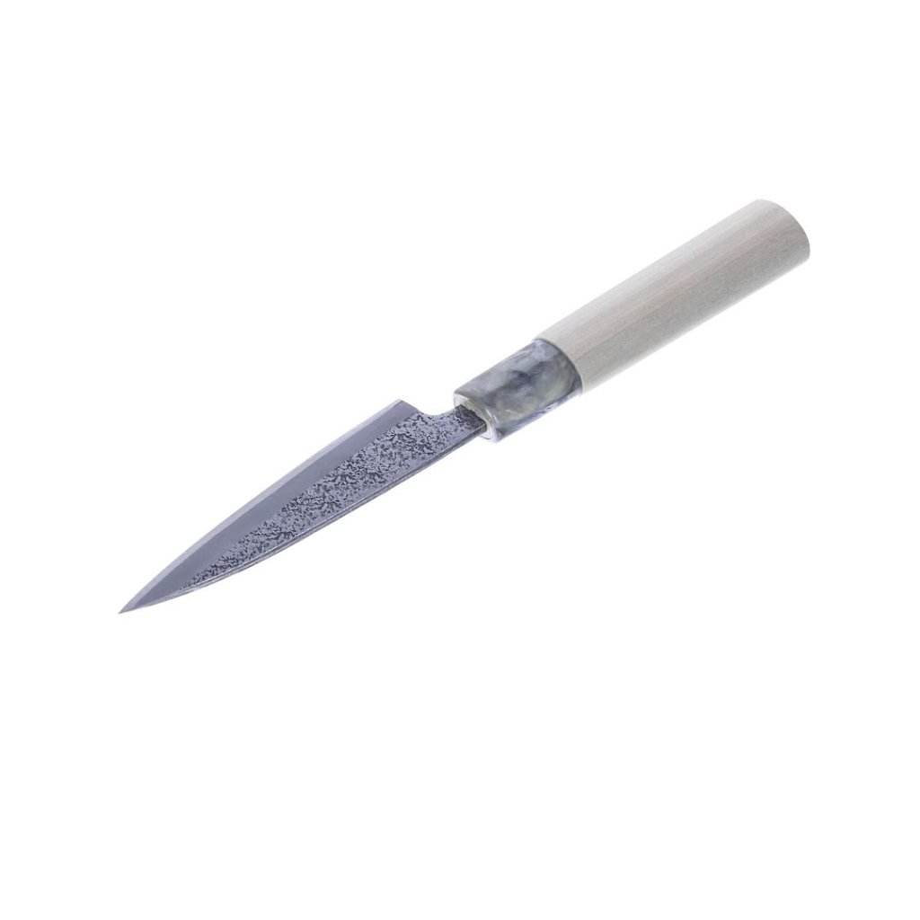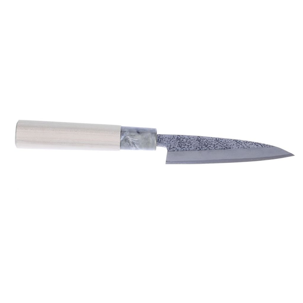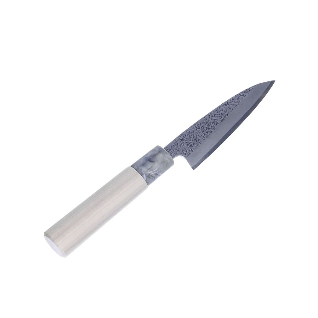 UMEBACHI RYUMA víceúčelový kuchyňský nůž s charakteristickou kladívkovou úpravou a délkou čepele 105 mm je spojením tradičního řemesla a inovativní technologie kovaných čepelí Banshu Miki, navržených pro odolnost, flexibilitu a dlouhotrvající ostrost. Tento všestranný nůž je ideální pro různé kuchyňské úkoly, od jemného krájení malých ryb, jako je makrela, až po jemné sekání, což z něj činí cenný nástroj pro domácí i venkovní použití. Pro dlouhou životnost je důležité po každém použití nůž ošetřit olejem, aby se předešlo korozi.