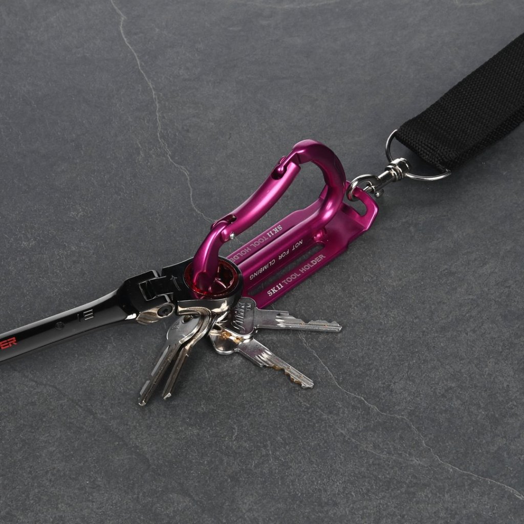 Karabina je vyrobena z hliníkové slitiny s maximální nosností 3 kg. Zahnuté očko na konci držáku nám umožňuje snadnější zavěšení nářadí. Vhodné pro 50 mm široké opasky nebo popruhy. Karabina není určena k horolezectví.