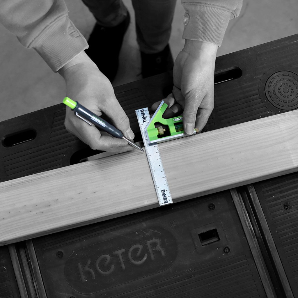 Úhelník TRACER obsahuje na CNC obráběné pracovní plochy pro nejvyšší přesnost, vyznačené úhly 45° a 90°. Nárazuvzdorná vodováha. Kombinovaný úhelník funguje také jako hloubkoměr.