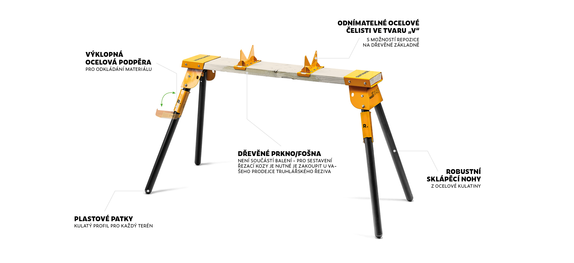 Bytelná ocelová koza CRAFTMAKER Cut Maker W40 na řezání dřeva s typickým černo-žlutým designem, díky kterému vzhledově zapadá do rodiny produktů CRAFTMAKER. Oceníte možnost výměny nosné fošny*, případné nastavení rozmístění čelistí - lze je snadno přemístit díky upevnění pomocí ocelových šroubů. Dále budou přínosem výklopné žluté packy na materiál. Když demontujete ocelové čelisti z dřevěné základny, můžete kozu W40 použít jako provizorní pracovní stolek. Snadno rozložíte i složíte. Stabilní řezací koza ideální pro všechny chalupáře a zahrádkáře.