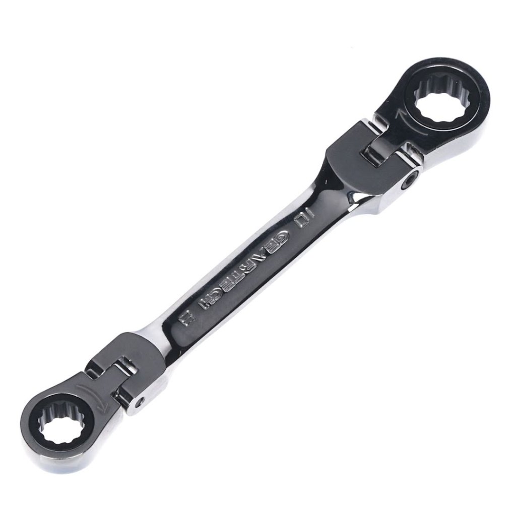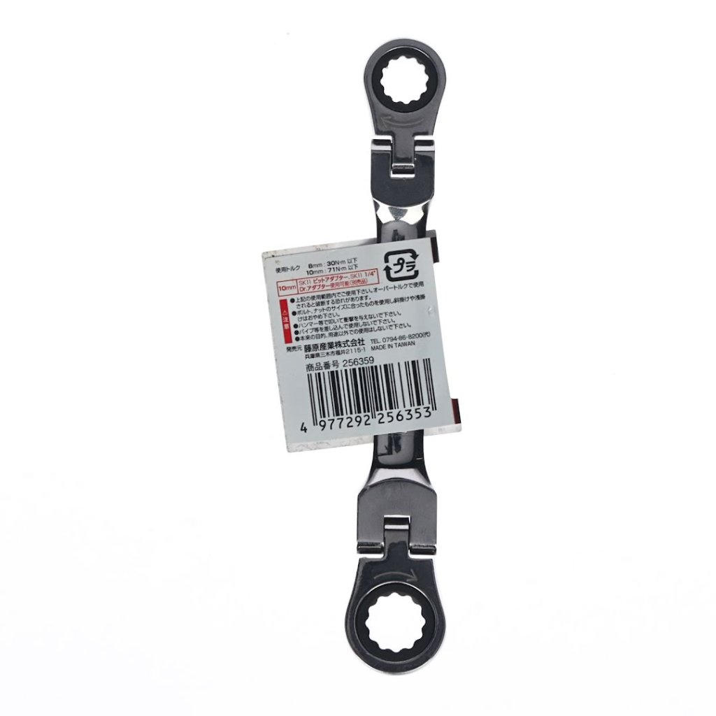 Stranový klíč s ráčnou SK11, model MFR0810S, je navržen pro precizní práci v omezených prostorech. Klíč zahrnuje ráčnový mechanismus, který umožňuje nepřetržité otáčení bez nutnosti sundání z matice nebo šroubu. Obě hlavy se otáčejí o 180 stupňů, což umožňuje všestranné použití. Strana 10 mm je kompatibilní s adaptérem na bity a 1/4 palcovým adaptérem pro nástrčné klíče od SK11, což rozšiřuje jeho funkčnost.