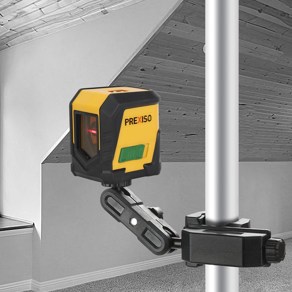 Samonivelační křížový laser PREXISO s ovládáním jedním tlačítkem. Rozsah nastavení ±4 stupně. Dvě jasné linie - horizontální a vertikální. Červená barva laseru.