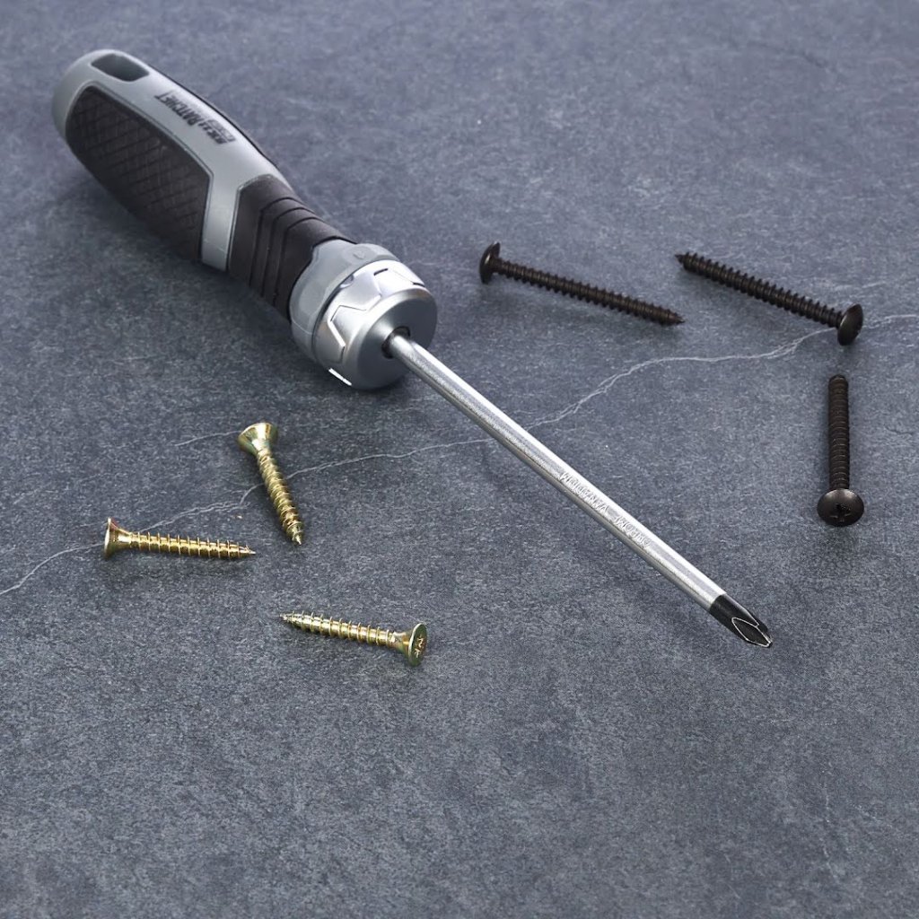 Šroubovák SK11, je univerzální nástroj, který lze použít jako běžný šroubovák nebo s ráčnou. Má délku dříku 125 mm, praktický ráčnový režim umožňuje kontinuální šroubování bez nutnosti opakovaných pohybů ruky, což je perfektní pro úkoly jako práce se šrouby. V režimu zajištění dříku funguje jako tradiční šroubovák, poskytující stabilitu dříku pro přesnou práci.