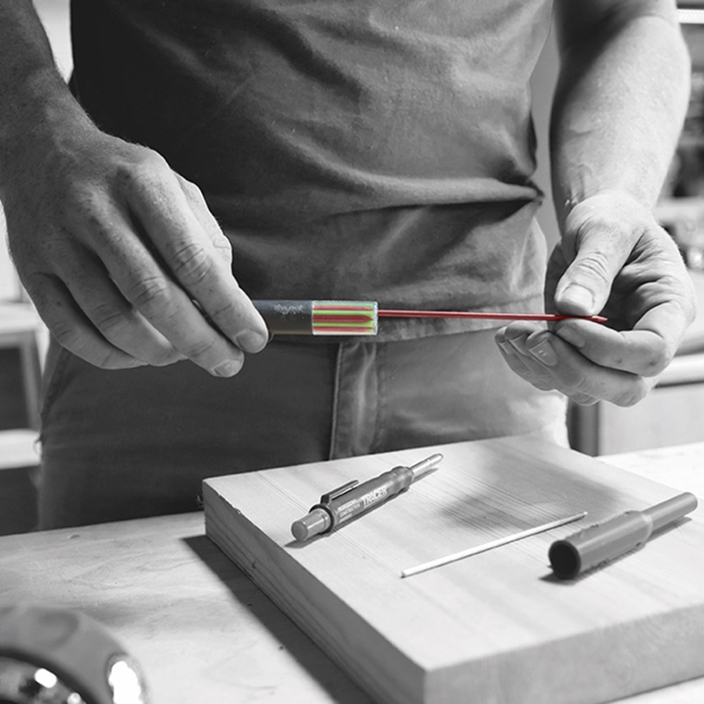 Profesionální tesařská a zednická tužka schopná psát na dřevo, ocel, zdivo, keramiku, gumu, sklo a spoustu dalších materiálů. Vyměnitelné tuhy. Vyrobeno v Německu.
