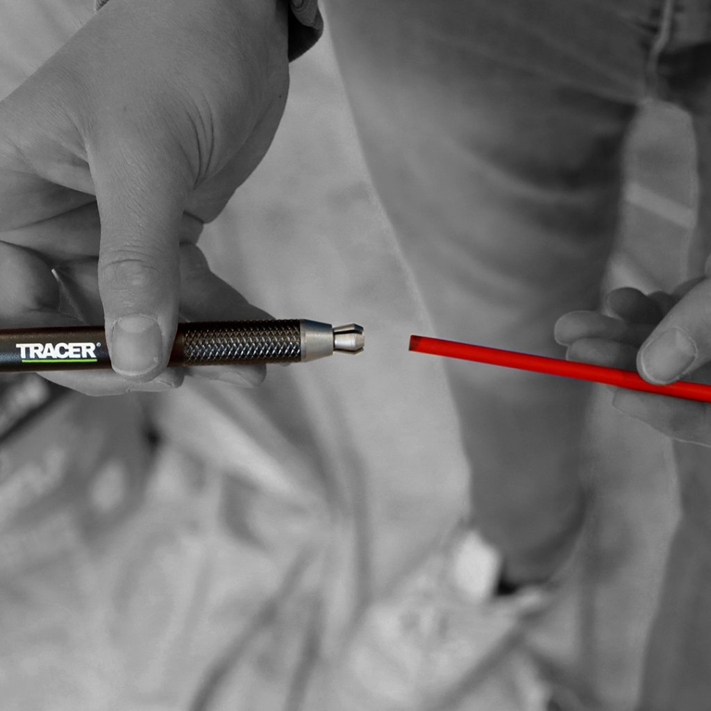 Všestranná tesařská a zednická tužka od britské značky TRACER je jedinou tužkou, kterou u sebe jako řemeslník budete chtít nosit. Dokáže psát na většinu povrchů. Díky výsuvným a vyměnitelným tuhám o délce 110 mm dokážete s tužkou TRACER označit jakékoliv úzké a hluboké otvory.