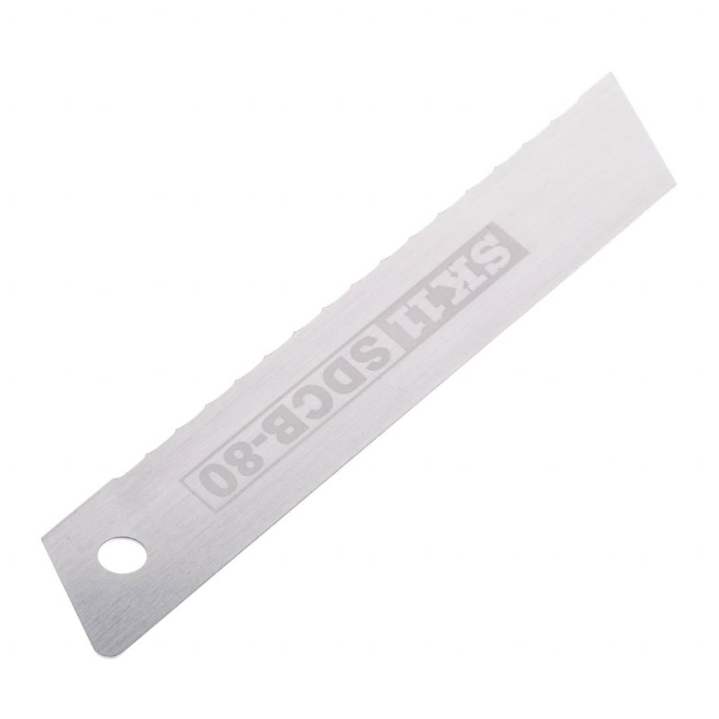 Náhradní čepel na řezání izolace SK11, model SDCB-80, je navržena pro přesnost a odolnost při řezání izolačních materiálů. Její unikátní vlnitý design čepele zajišťuje hladké řezy skrz polystyrenovou pěnu, skelnou vatu a dokonce i obalovou fólii izolačních materiálů. S rozměry 18 mm šířky, 107 mm výšky a tloušťkou čepele 0,45 mm je tato 80 mm dlouhá čepel vyrobena bez zářezů, aby se zabránilo neočekávanému zlomení, což zvyšuje bezpečnost a spolehlivost. Je také dostatečně všestranná pro řezání kartonu a bavlněných provazů. Kompatibilní s vysunovacím nožem SK11 SDC-80.