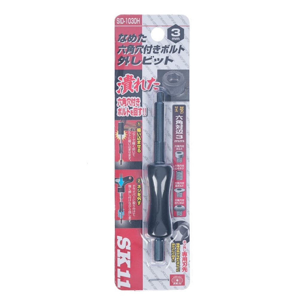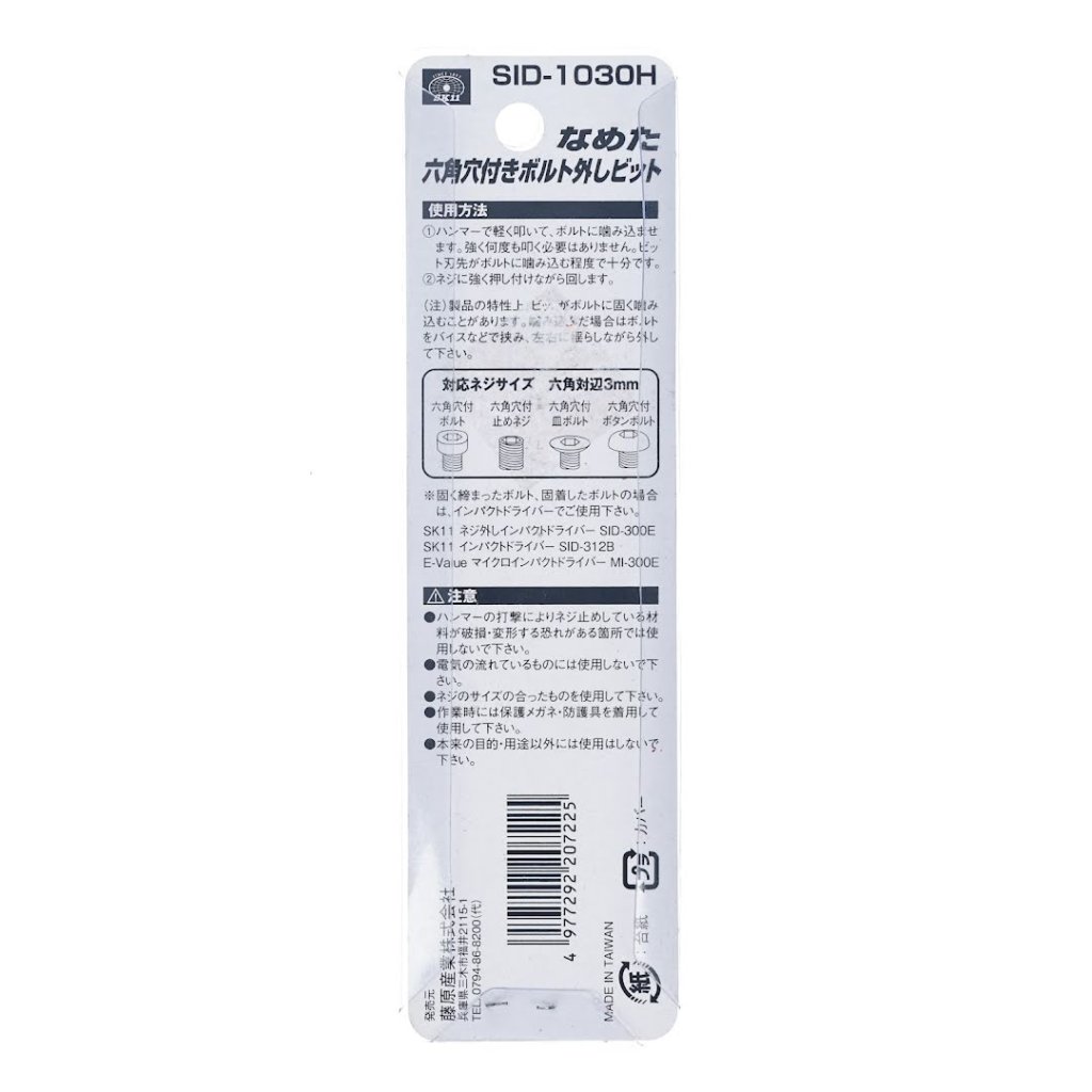 Vytahovač stržených šroubů SK11, model SID-1030, je navržen pro odstranění šroubů s vnitřním šestihranem, které nelze otočit běžným šestihranným klíčem. Tento nástroj disponuje speciálním tvarem čepele, který se silně zakousne do poškozeného šroubu pro snadné odstranění. Bit je kompatibilní s velikostmi 3 mm šestihranu. Zajistěte bezpečnost tím, že se vyhnete použití na materiálech náchylných k poškození nebo deformaci údery kladiva a nepoužívejte na elektricky živé součástky.