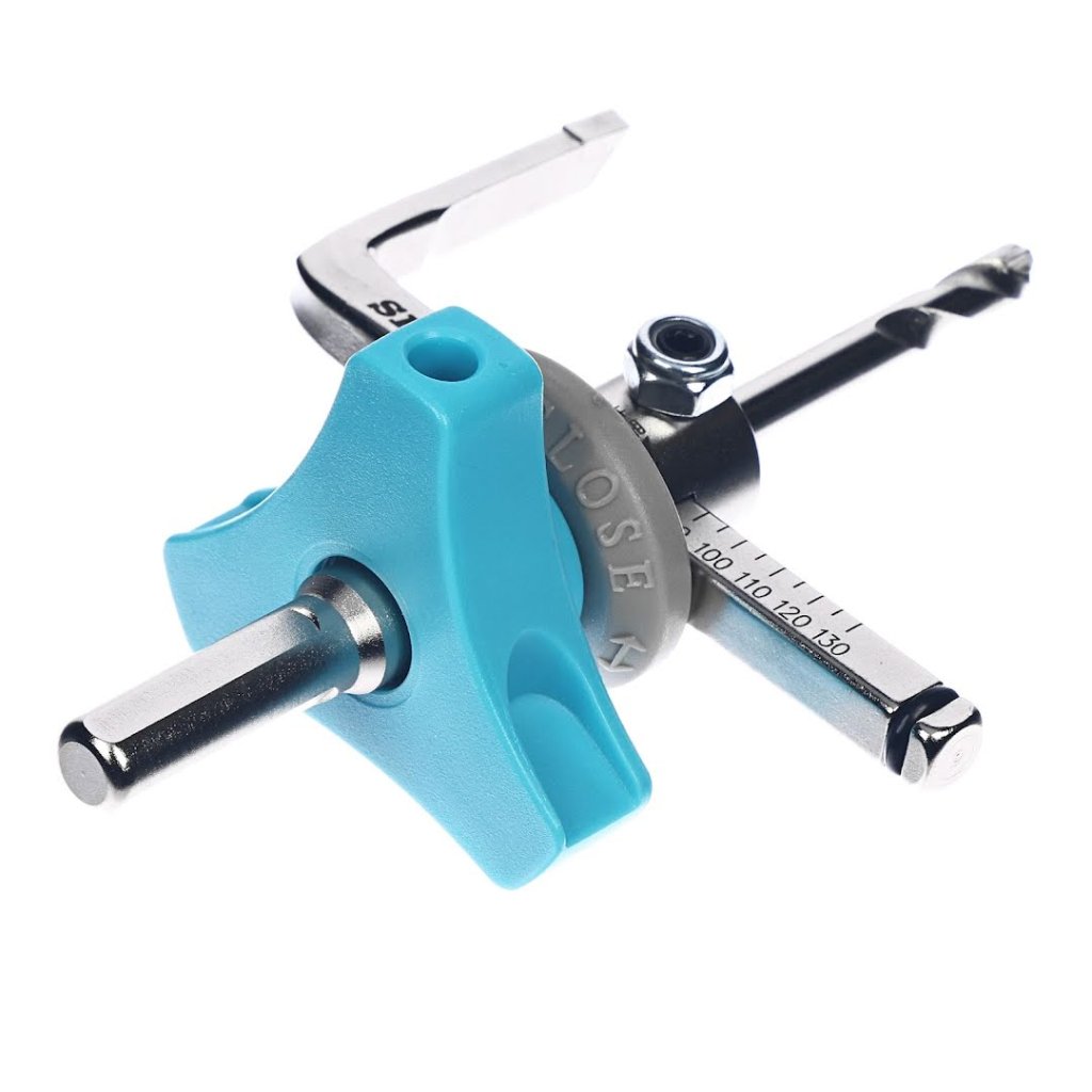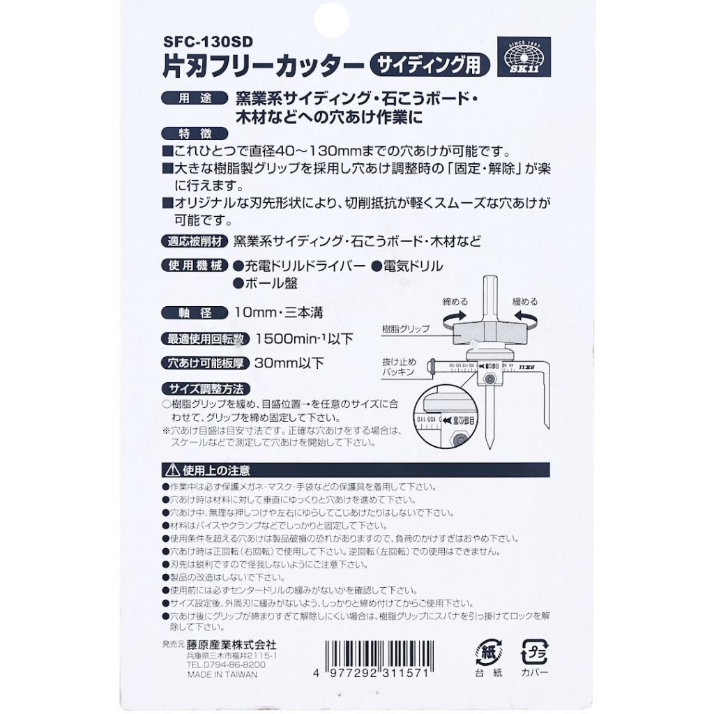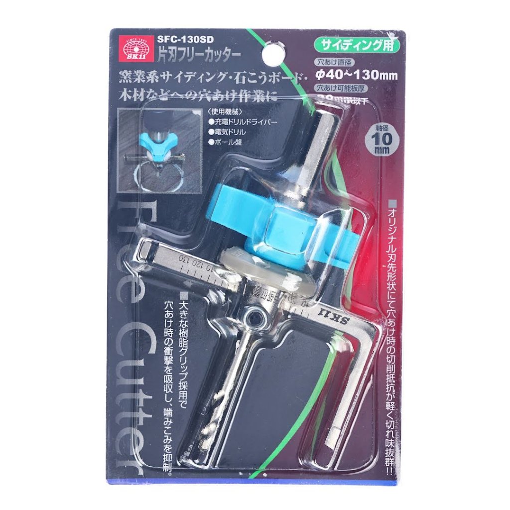 Nastavitelný kruhový vrták SK11, model SFC-130SD, je ideální pro řezání otvorů v keramických obkladech, sádrokartonových deskách a dřevě. Tento nástroj s originálním tvarem čepele minimalizuje odpor pro vynikající výkon při řezání. Je vybaven velkou pryskyřičnou rukojetí, která absorbuje nárazy během provozu a zabraňuje zasekávání. Konstrukce řezáku také umožňuje snadné uvolnění pomocí klíče, pokud dojde k zablokování. Vhodný pro použití s akumulátorovými vrtačkami, elektrickými vrtačkami a stojanovými vrtačkami, má průměr stopky 10 mm a může řezat otvory o průměru 40 až 130 mm v materiálech o tloušťce až 30 mm.