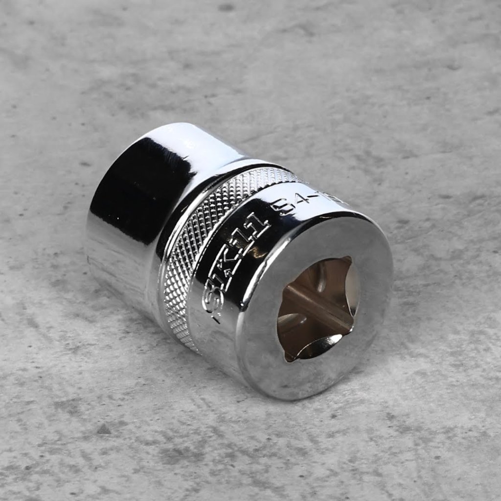 Nástrčný klíč (ořech) značky SK11 na odstranění šroubů, model S4-19RE, je všestranný nástroj pro efektivní manipulaci se zaoblenými a strženými šrouby. Tento speciálně tvarovaný nástavec disponuje čtvercovým upínáním o velikosti 12,7 mm a chromovanou povrchovou úpravou. Ideální pro utahování a povolování šroubů a matic.