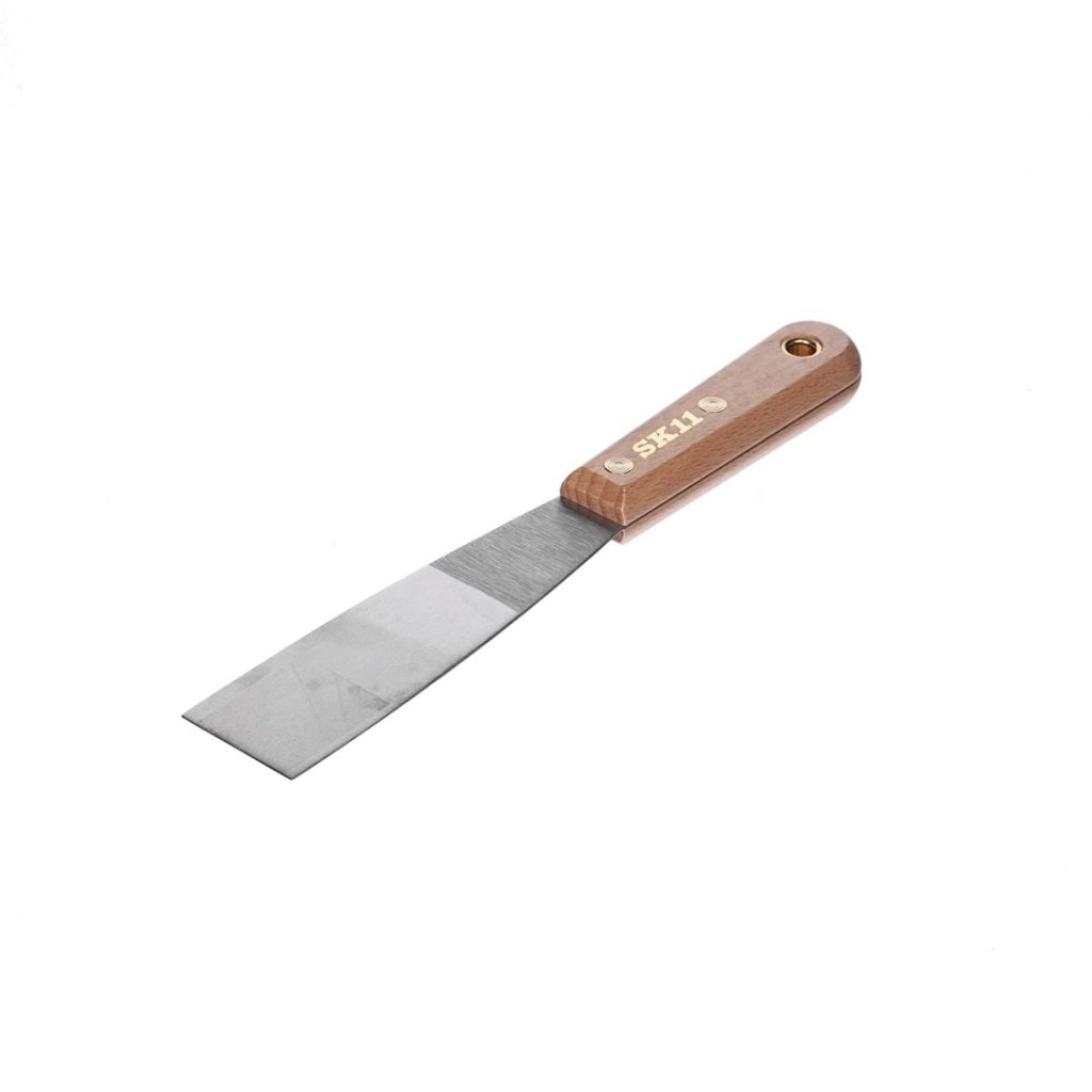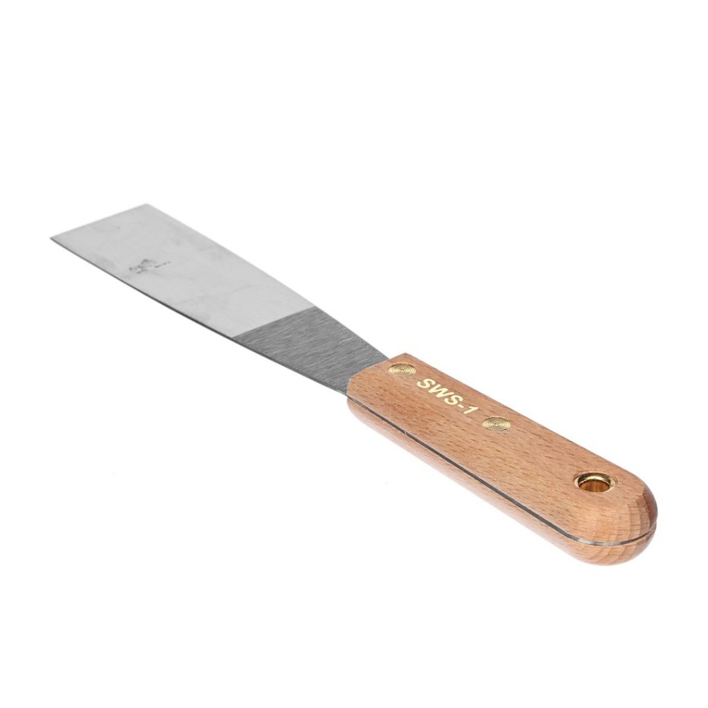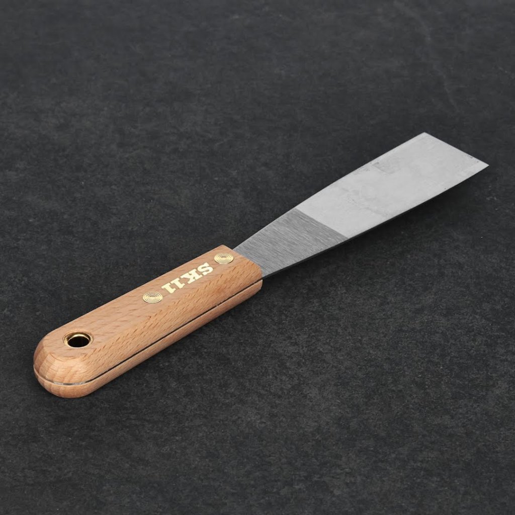 Nerezová špachtle SK11, model SWS-1, má čepel z nerezové oceli, která je odolná vůči korozi a snadno se udržuje. Je ideální pro odstraňování barvy a aplikaci lepidel. Ergonomická dřevěná rukojeť zajišťuje pohodlné držení během používání.