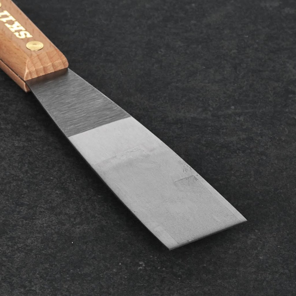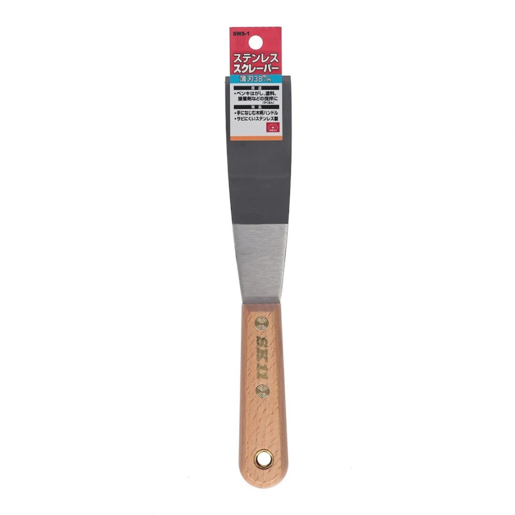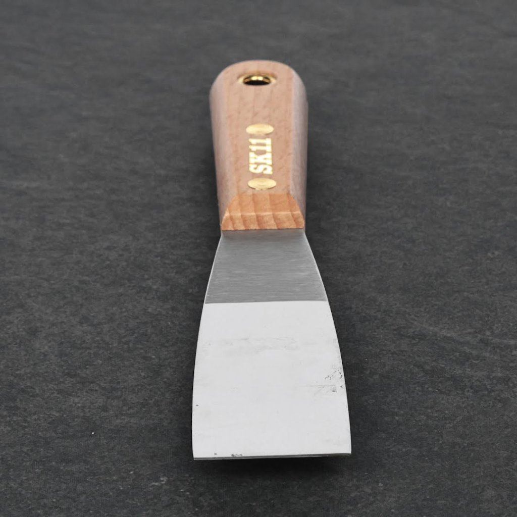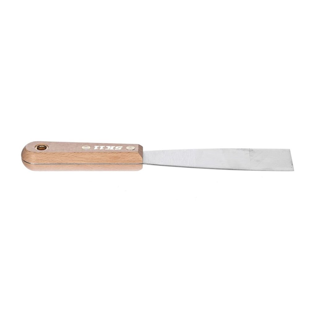 Nerezová špachtle SK11, model SWS-1, má čepel z nerezové oceli, která je odolná vůči korozi a snadno se udržuje. Je ideální pro odstraňování barvy a aplikaci lepidel. Ergonomická dřevěná rukojeť zajišťuje pohodlné držení během používání.