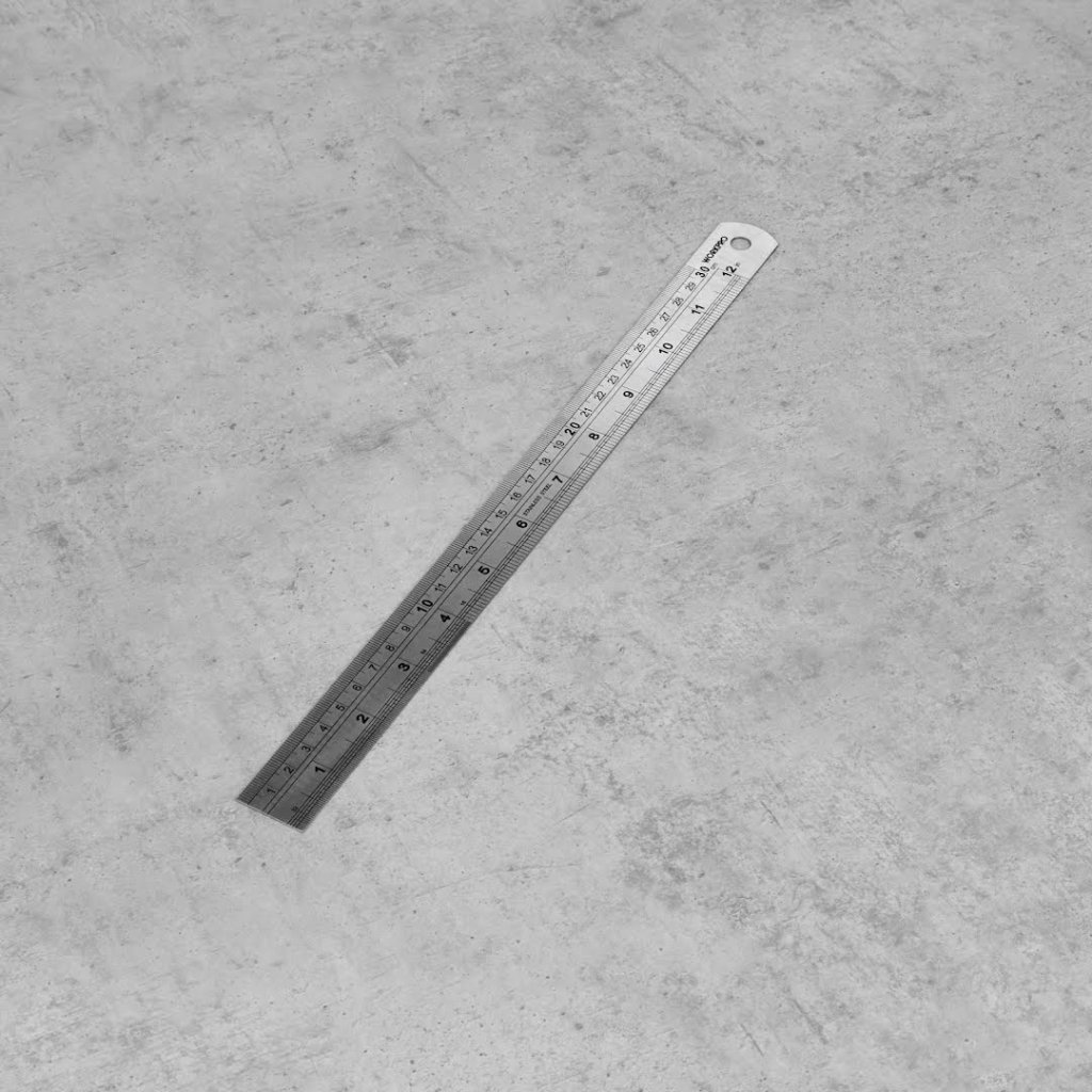 Pravítko WORKPRO s nerezovým tělem a metrickou stupnicí 0 až 300 mm a palcovou stupnicí do 12". Z druhé strany pravítka je konverzní tabulka pro převody.