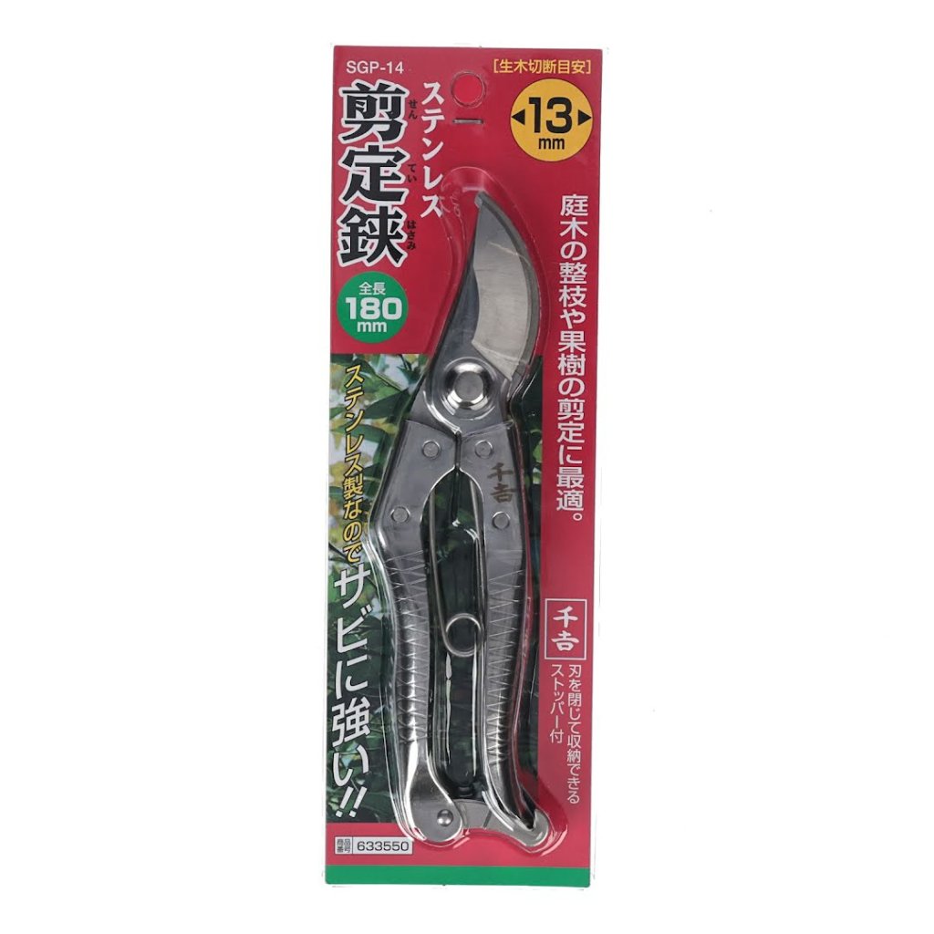 Nerezové zahradní nůžky SENKICHI, model SGP-14, jsou navrženy pro prořezávací a zastřihovací úkoly. Jsou vyrobeny z nerezové oceli, což je činí odolnými proti korozi. Nůžky mají celkovou délku 180 mm a mohou stříhat čerstvé dřevo do tloušťky 13 mm.
