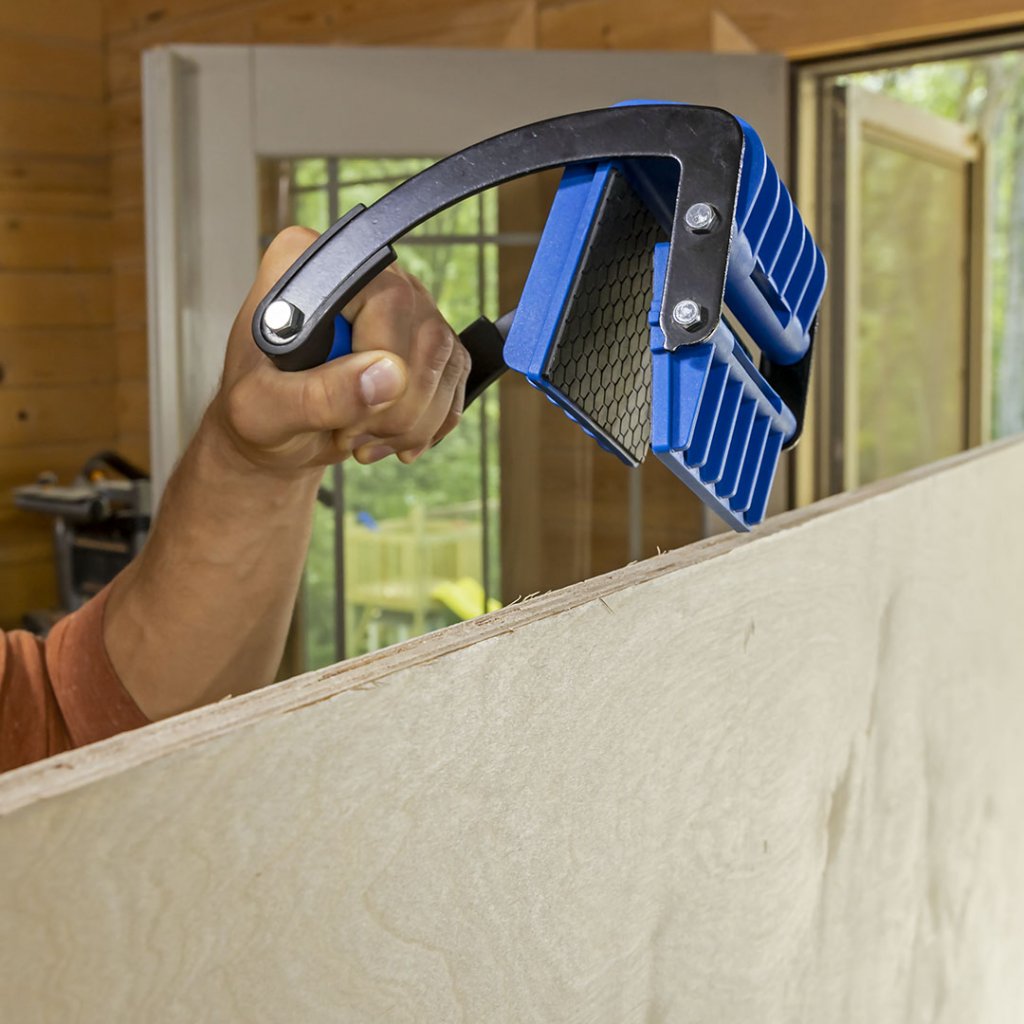 Přenášejte s jistotou velké desky s nosičem KREG®. Podložky jeho čelistí jsou potaženy protiskluzovým povrchem KREG GripMaxx™ Menší námaha při práci a bezpečné držení bez zbytečného poškození přenášeného materiálu a dokonce i na křehkých překližkových dých. Praktická vychytávka s ergonomickou rukojetí s polstrováním, která unese materiál o síle až 19 mm, jistě ocení každý řemeslník.