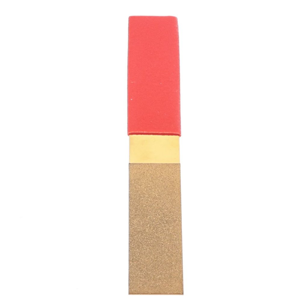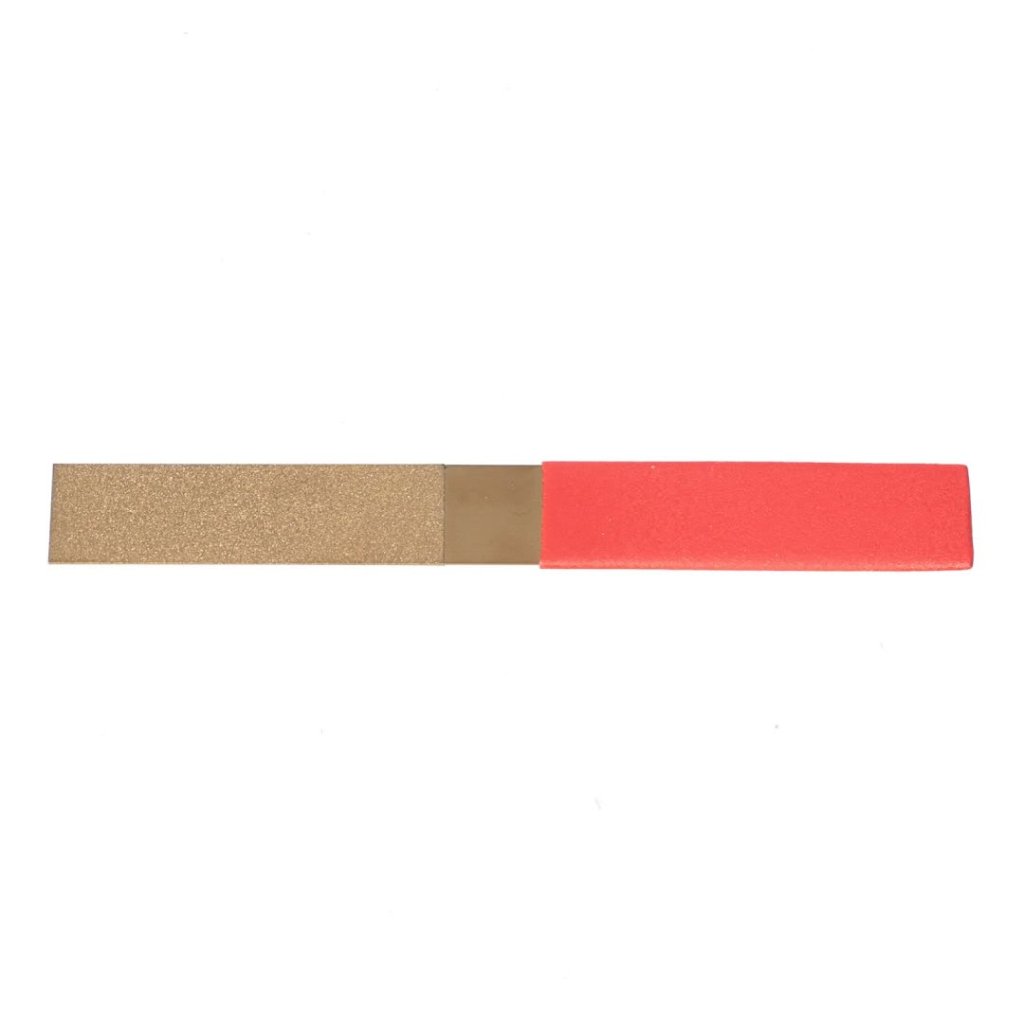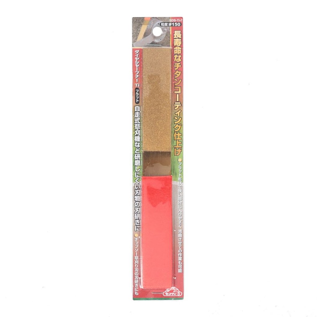 Plochý pilník s titanovým povlakem a diamantovým zrnem SAFETY-3, model SDS-Ti-F, je odolný ostřič navržený pro dlouhodobé použití. S rozměry 210 x 30 x 5 mm váží 55 g. Tento nástroj je ideální pro ostření obtížných čepelí, jako jsou čepele na samohybných sekačkách, s použitím diamantového prášku elektrolyticky naneseného na základní materiál. Jeho plochý tvar umožňuje snadný přístup do úzkých oblastí a efektivně pracuje na zakřivených površích. Ostřič má zrnitost #150, což zajišťuje efektivní ostření.