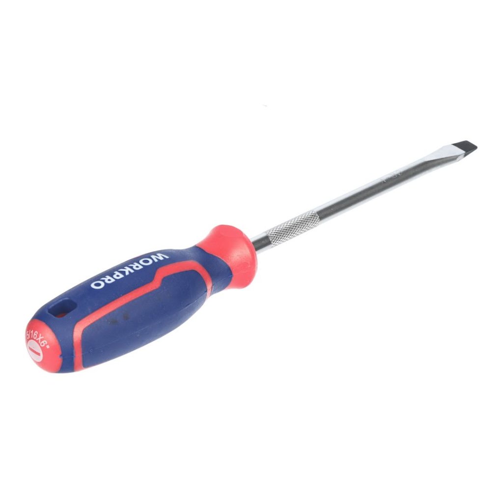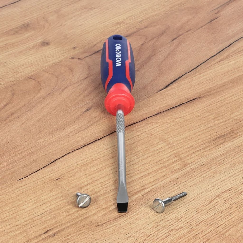 Nástroj od značky WORKPRO pomáhá při šroubování plochých šroubů do dřeva nebo plechu. Díky pevnému a ergonomickému úchopu budete moci pracovat s precizností a komfortem. Šroubovák disponuje délkou 152 mm a hrotem o velikosti 10, což vám zaručí dobrý dosah.
