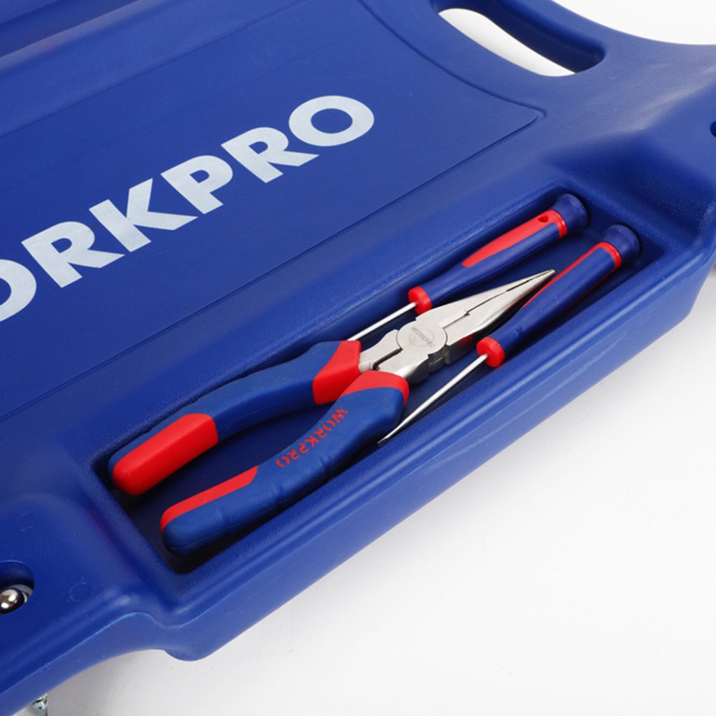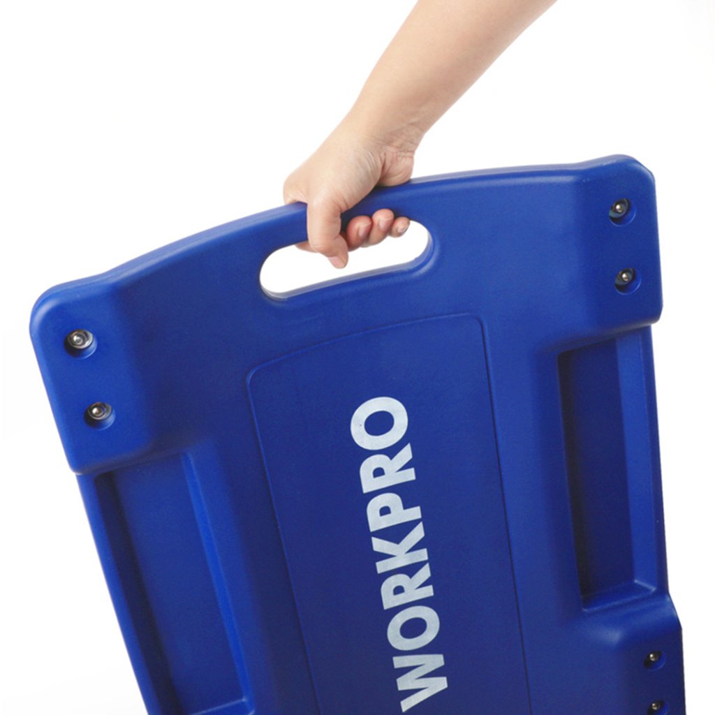 Pojízdné montážní lehátko WORKPRO pro bezpečnou s efektivní montáže či opravy podvozku či strojů. Lehátko je vyrobeno z jednoho kusu plastu. Tvarováno pro větší pohodlí. Oceníte boční přihrádky pro nářadí a spojovací materiál. 6 koleček z nylonu na kuličkových ložiscích.