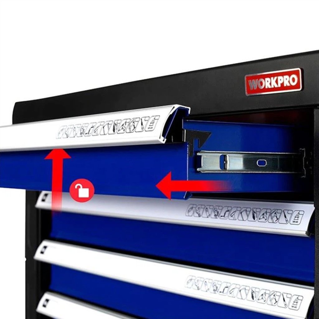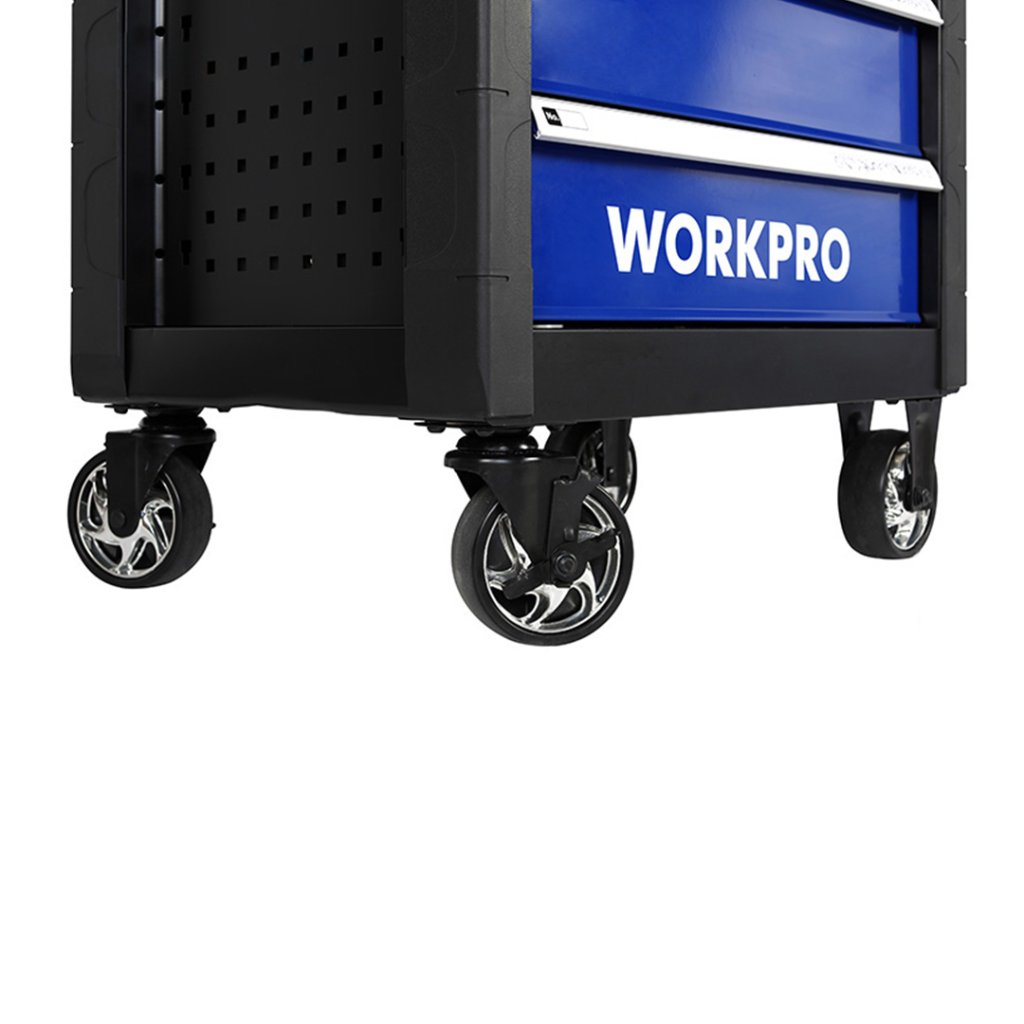 Organizace nářadí v dílně je alfa omega efektivity vašeho byznysu. WORKPRO vám přináší robustní kovový pojízdný dílenský box. Naložíte do něj až 300 kilogramů nářadí, které si v něm můžete snadno převážet po rovném povrchu kamkoliv po dílně i mimo ni. Je uzamykatelný a tak se vám nikde nic nevysype.