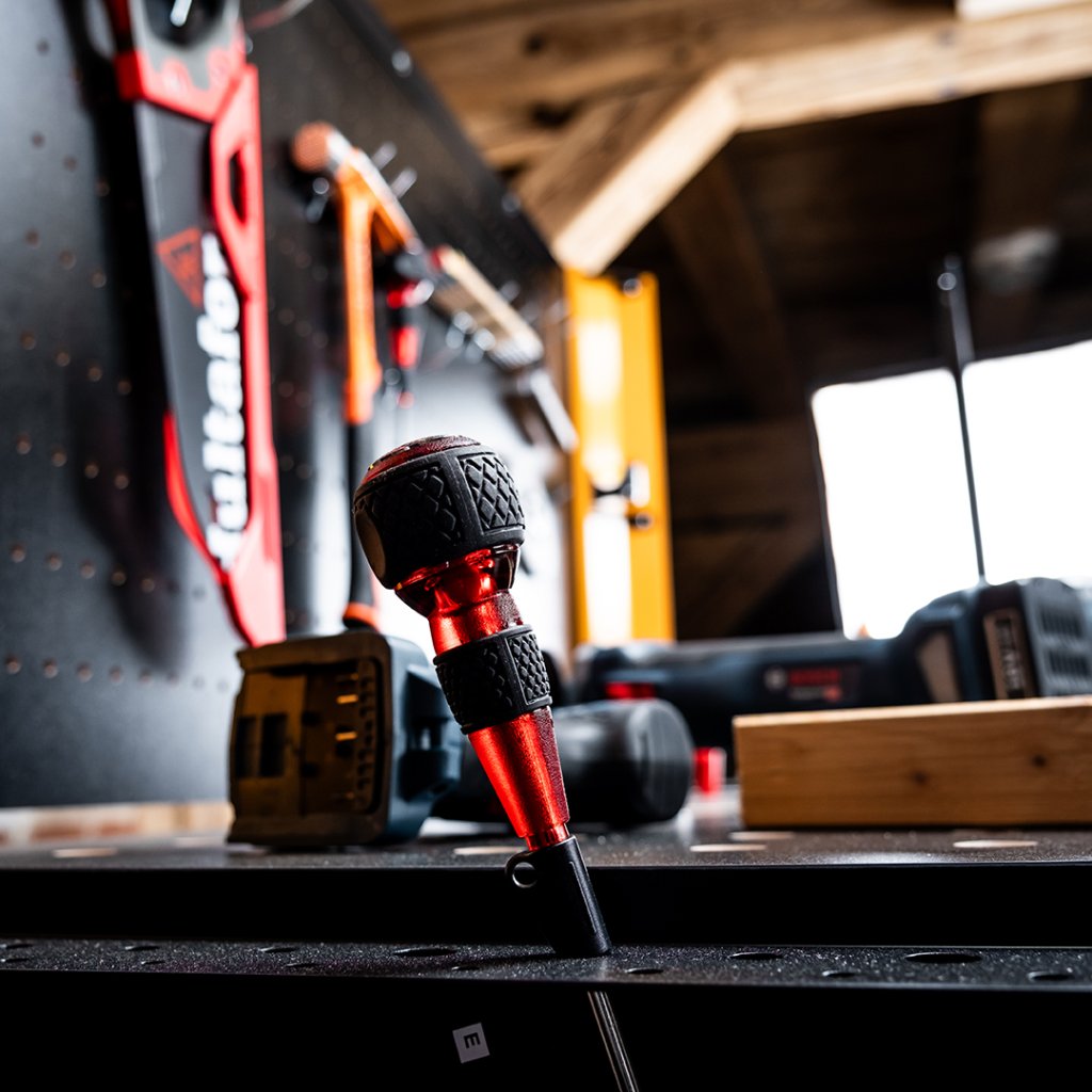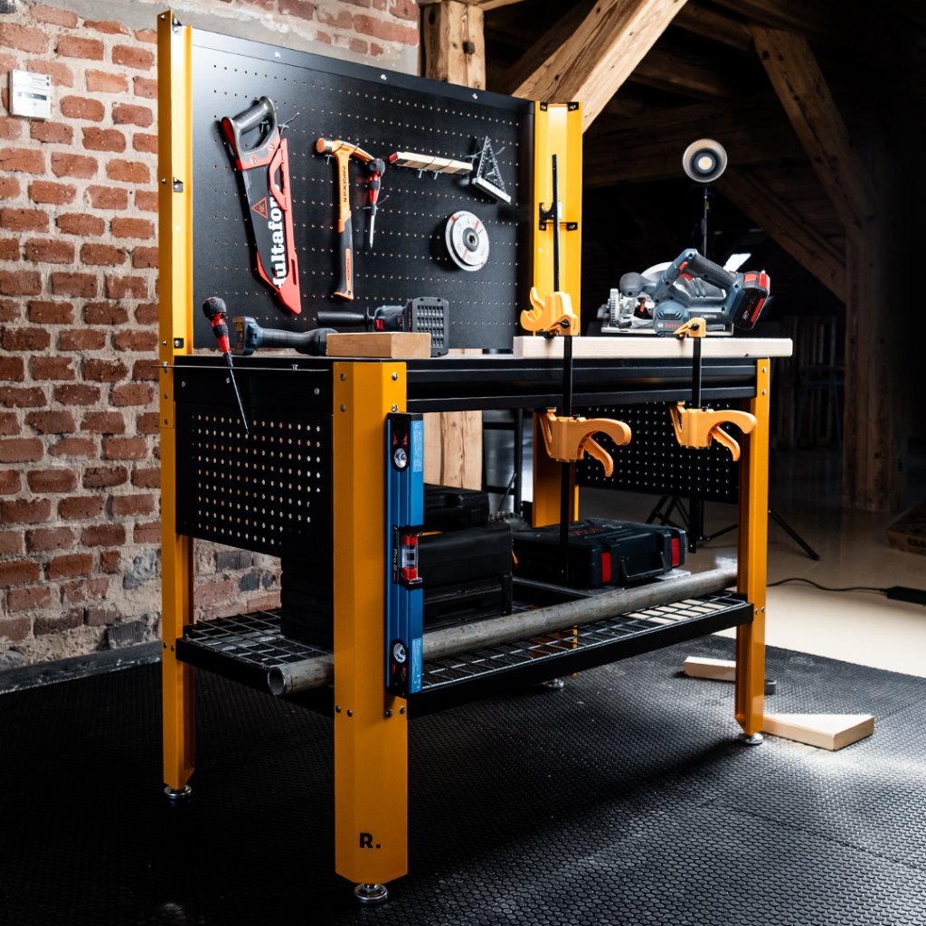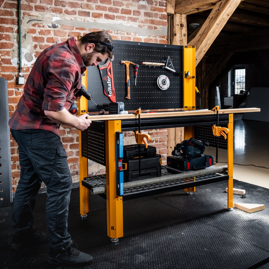 Stěna za stolem slouží jako multifunkční organizér s háčky, lištami a držáky, které umožňují snadno pověsit různé nářadí a příslušenství tak, aby bylo vždy po ruce a přehledně rozmístěné. Nabízí dostatek prostoru pro uložení nářadí, součástek i dalších potřebných věcí.