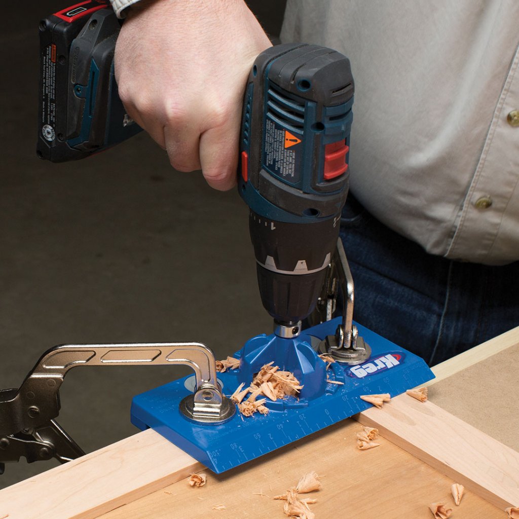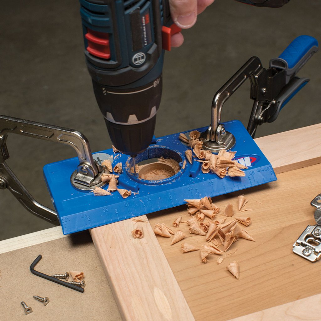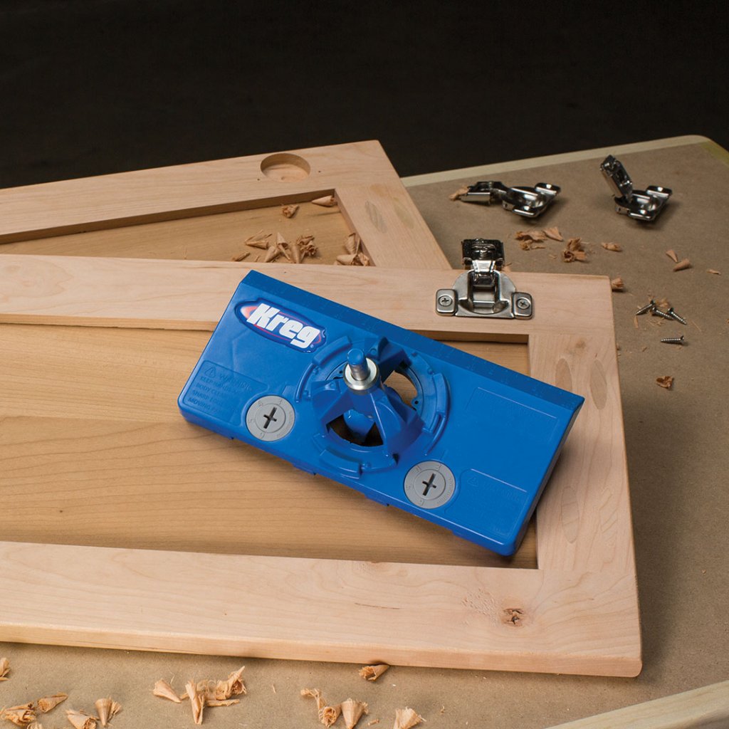 Přípravek na skryté závěsy KREG® pro instalaci dveří skříní pomocí skrytých závěsů. Snadno použitelný přípravek zajišťuje přesné vyrovnání závěsů, díky kterému můžete snadno nainstalovat dveře, které skvěle padnou a dobře se zavírají. Přípravek na skryté závěsy dobře pracuje s běžným vrtákem a přiloženou frézou z tvrdokovu. Skryté panty jsou vhodné pro montáž dveří skříněk, protože nejdou vidět, jsou nastavitelné a fungují velmi dobře. Jejich montáž však vyžaduje vyvrtání velkého otvoru ve velmi specifické poloze a hloubce. Přípravek na skryté závěsy KREG® je řešení při vrtání těchto děr a umožňuje vám pracovat s frézou z tvrdokovu, který je dodáván s přípravkem.