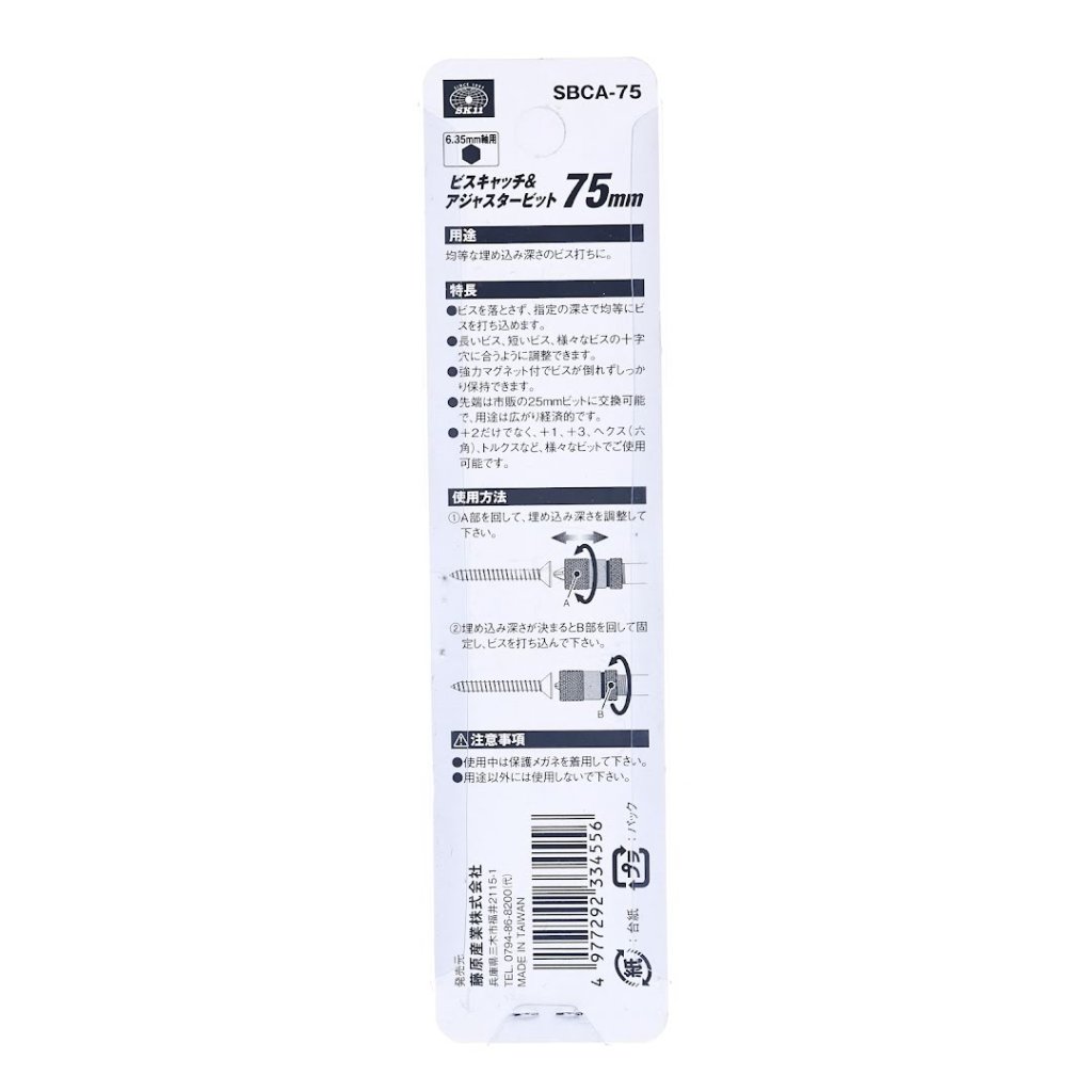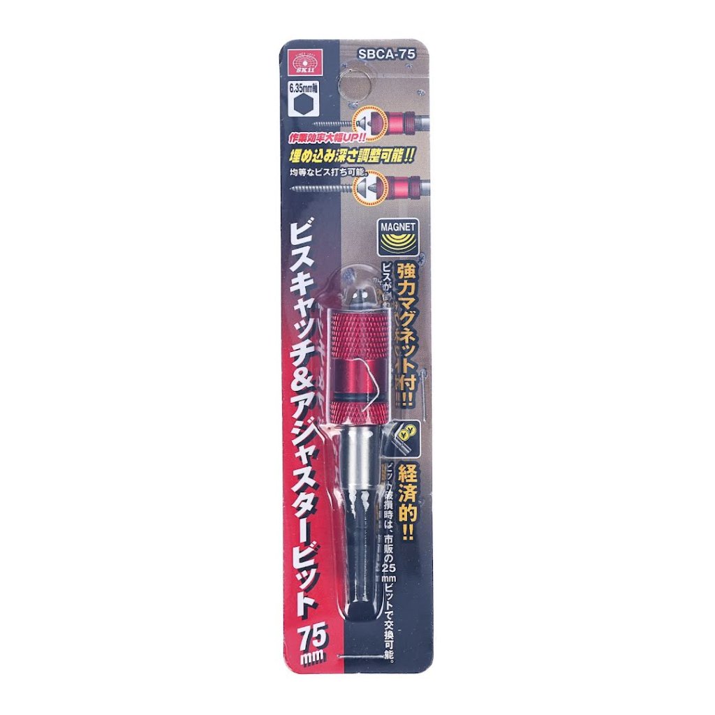 Nastavitelný nástavec bitů SK11, model SBCA-75, je navržen tak, aby zajistil, že šrouby a hřebíky zůstanou na místě díky své magnetické funkci uchycení. S délkou 75 mm a šestihrannou stopkou 6,35 mm je vybaven jemným nastavovacím mechanismem pro přesnou kontrolu hloubky hlavy šroubu. Vyměnitelný 25 mm bit zajišťuje použití i v případě poškození bitu.
