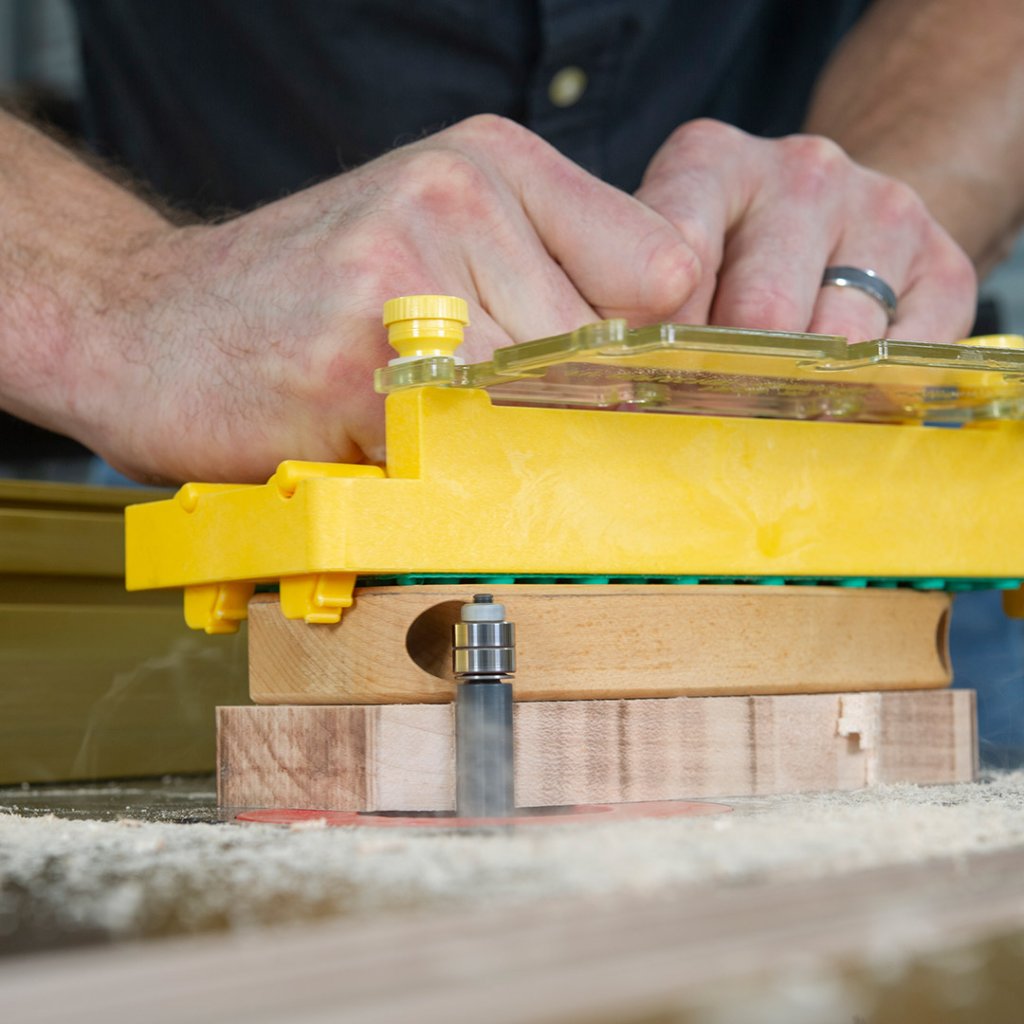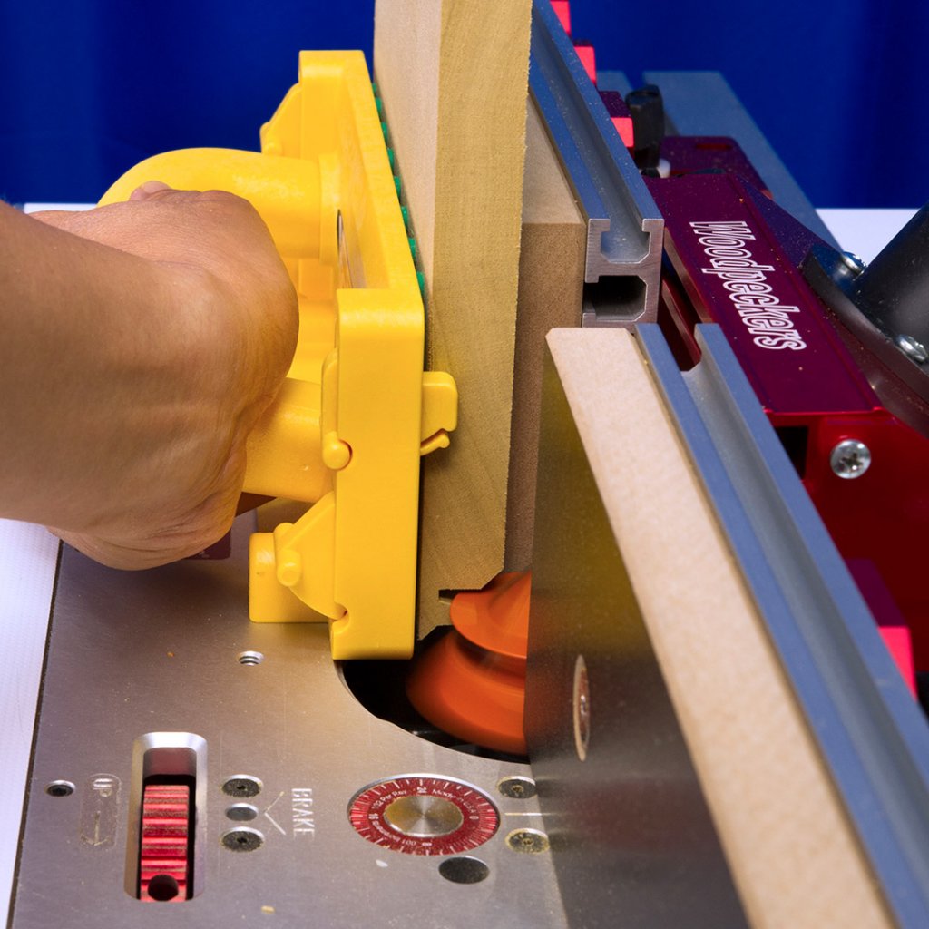 Získejte naprostou kontrolu nad obrobkem bez nutnosti vystavit vaše ruce nebezpečí. Chytré háčky se uzamknou v zasunuté poloze a udrží je mimo dosah frézovacího bitu. Deflektor / konektor chrání před úlomky a třískami.