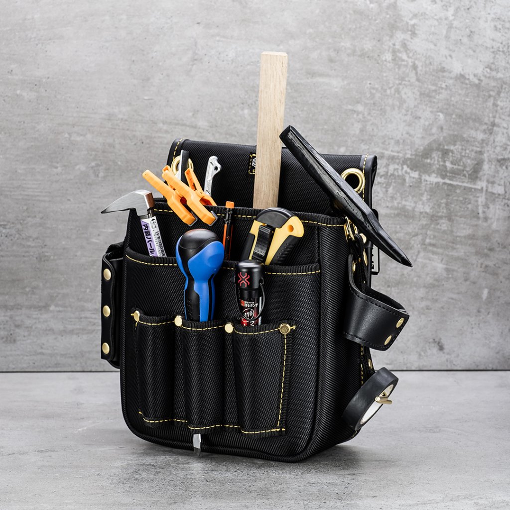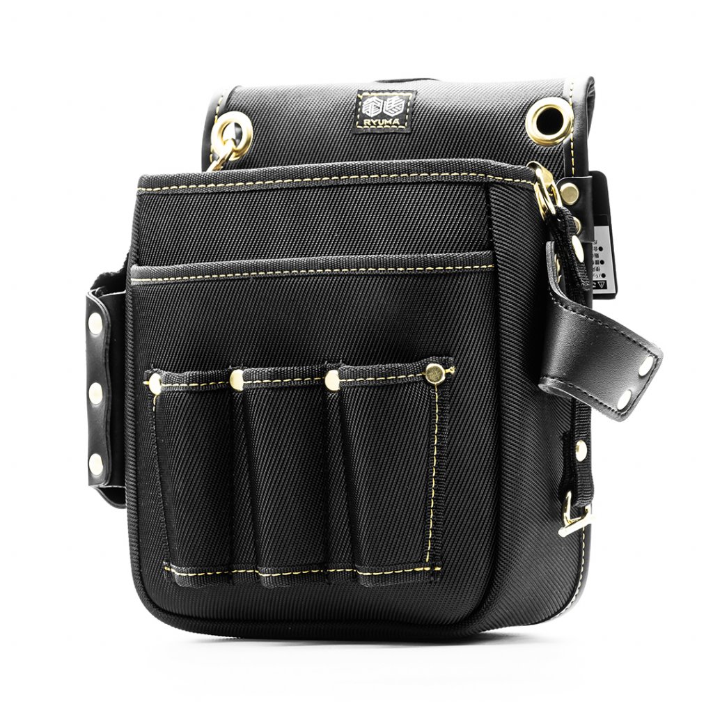 Robustní brašna pro řemeslníky od značky RYUMA, kterou snadno připevníte na opasek. K brašně je připevněna malá karabina a poutko s popruhem.