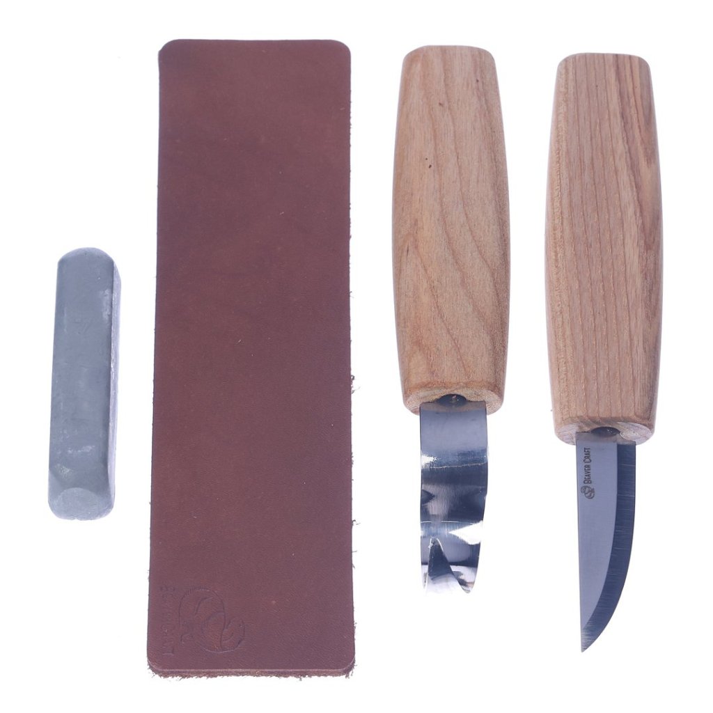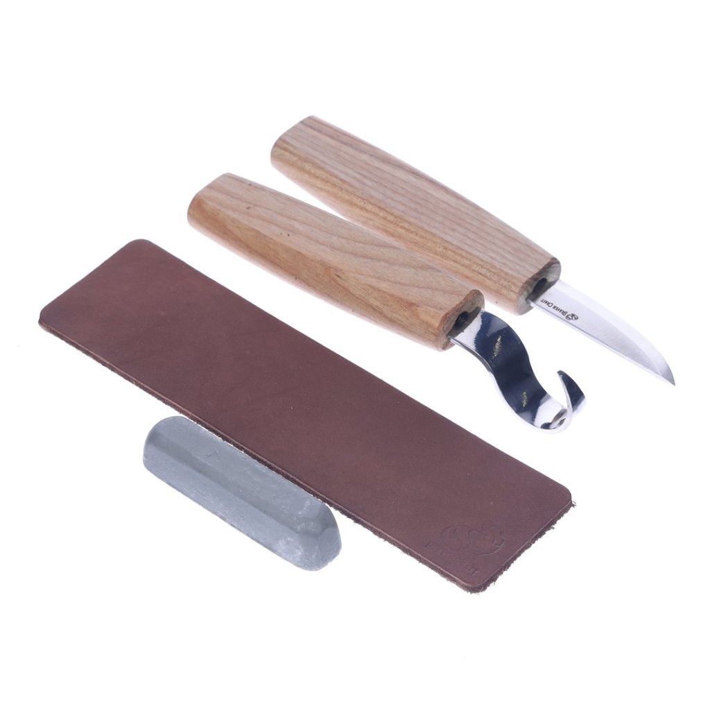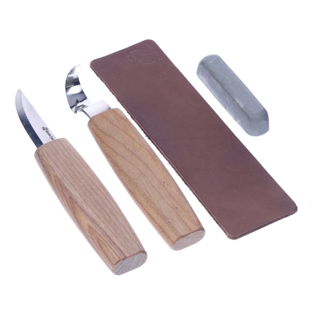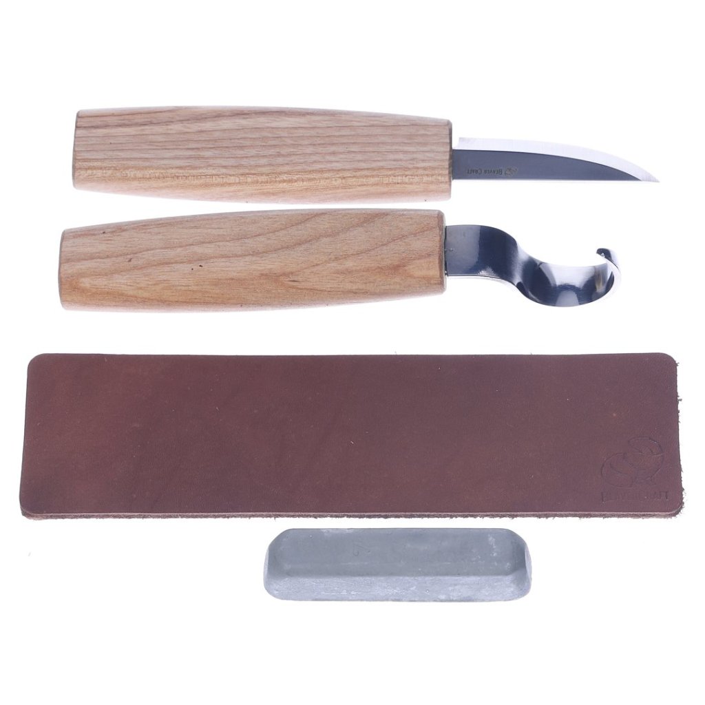 Sada BEAVERCRAFT na vyřezávání lžic obsahuje řezbářský nůž s čepelí o šířce 15 mm a lžícový nůž s průměrem zaoblení 25 mm. Čepele jsou vyrobeny z kvalitní uhlíkové oceli a rukojeti z jasanového dřeva pro maximální komfort při práci. Součástí balení je obtahovací kožený řemen z hovězí kůže určený k ostření a zelená brusná pasta ze zrnitostí 5-7 mikronů. Výrobky obsažené v sadě lze zakoupit i samostatně.
