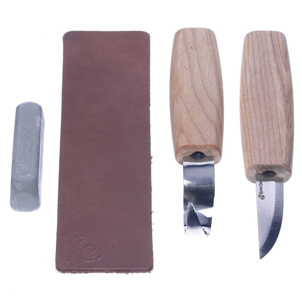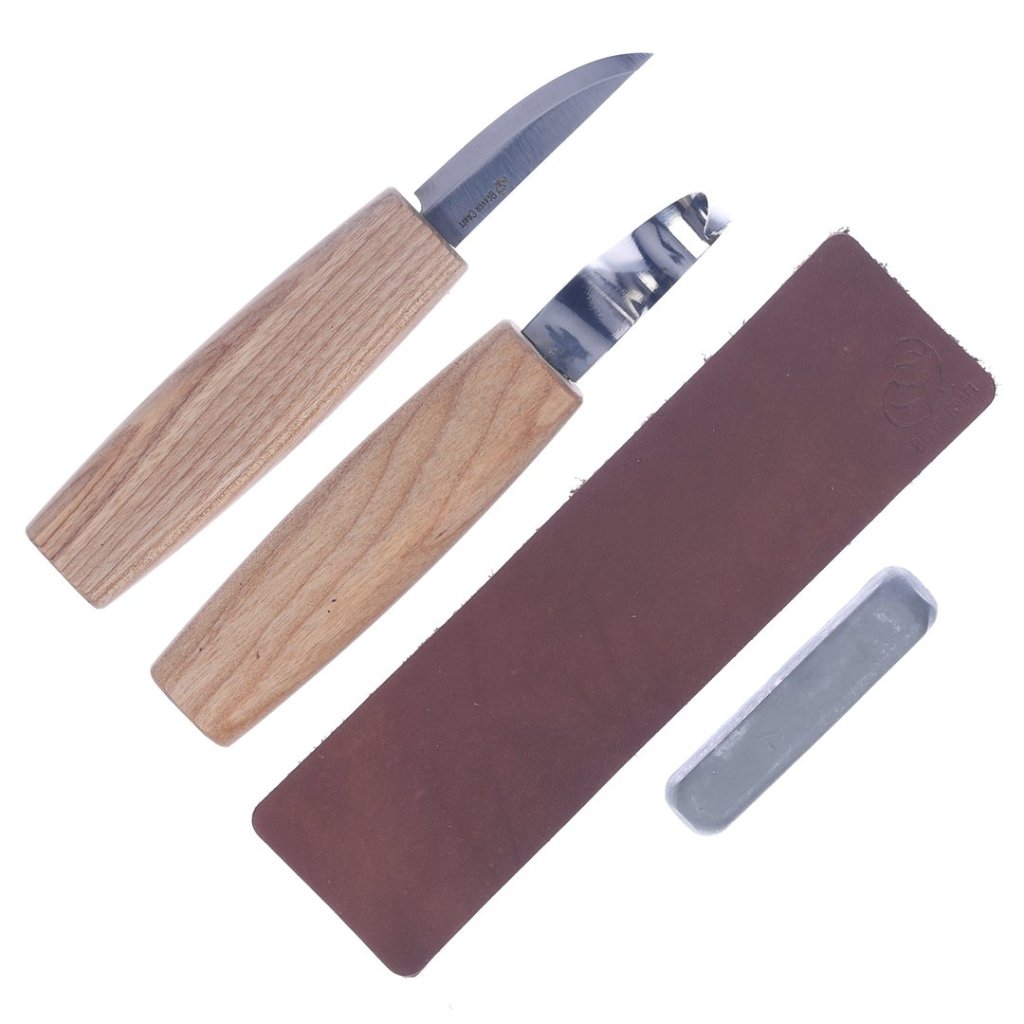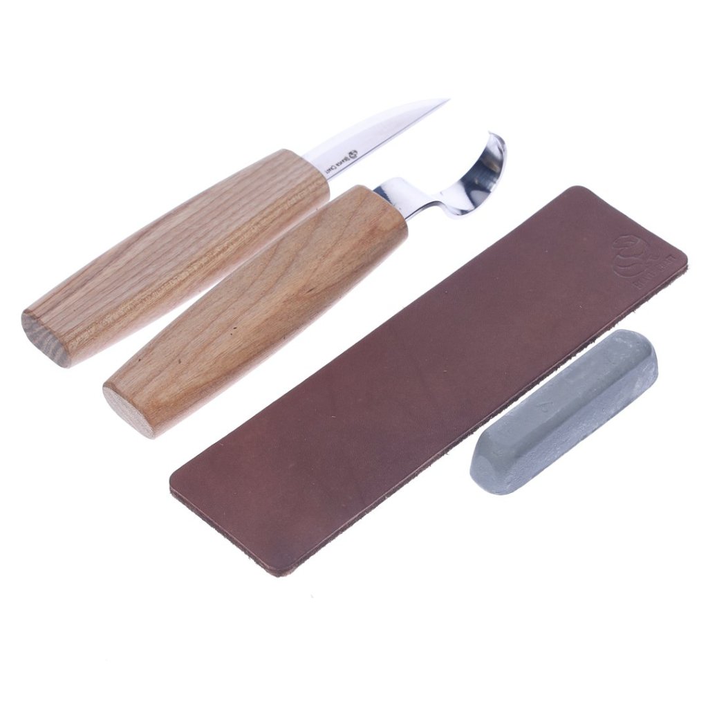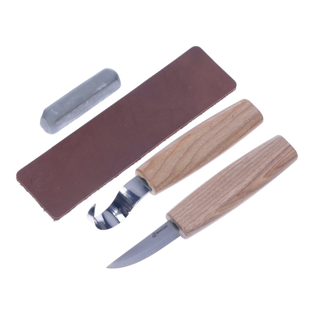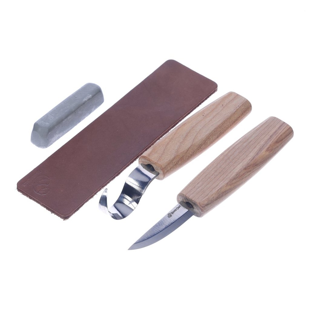 Sada BEAVERCRAFT na vyřezávání lžic obsahuje řezbářský nůž s čepelí o šířce 15 mm a lžícový nůž s průměrem zaoblení 25 mm. Čepele jsou vyrobeny z kvalitní uhlíkové oceli a rukojeti z jasanového dřeva pro maximální komfort při práci. Součástí balení je obtahovací kožený řemen z hovězí kůže určený k ostření a zelená brusná pasta ze zrnitostí 5-7 mikronů. Výrobky obsažené v sadě lze zakoupit i samostatně.