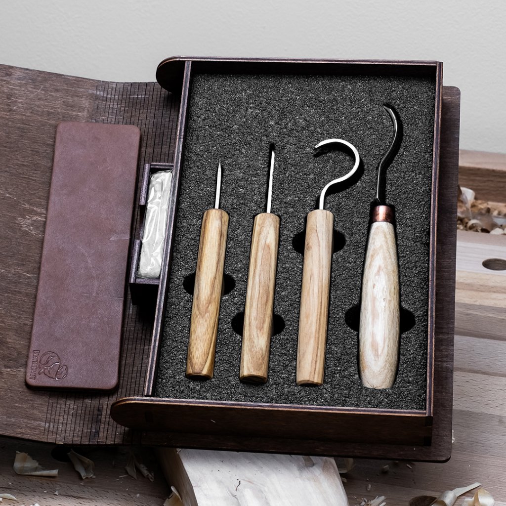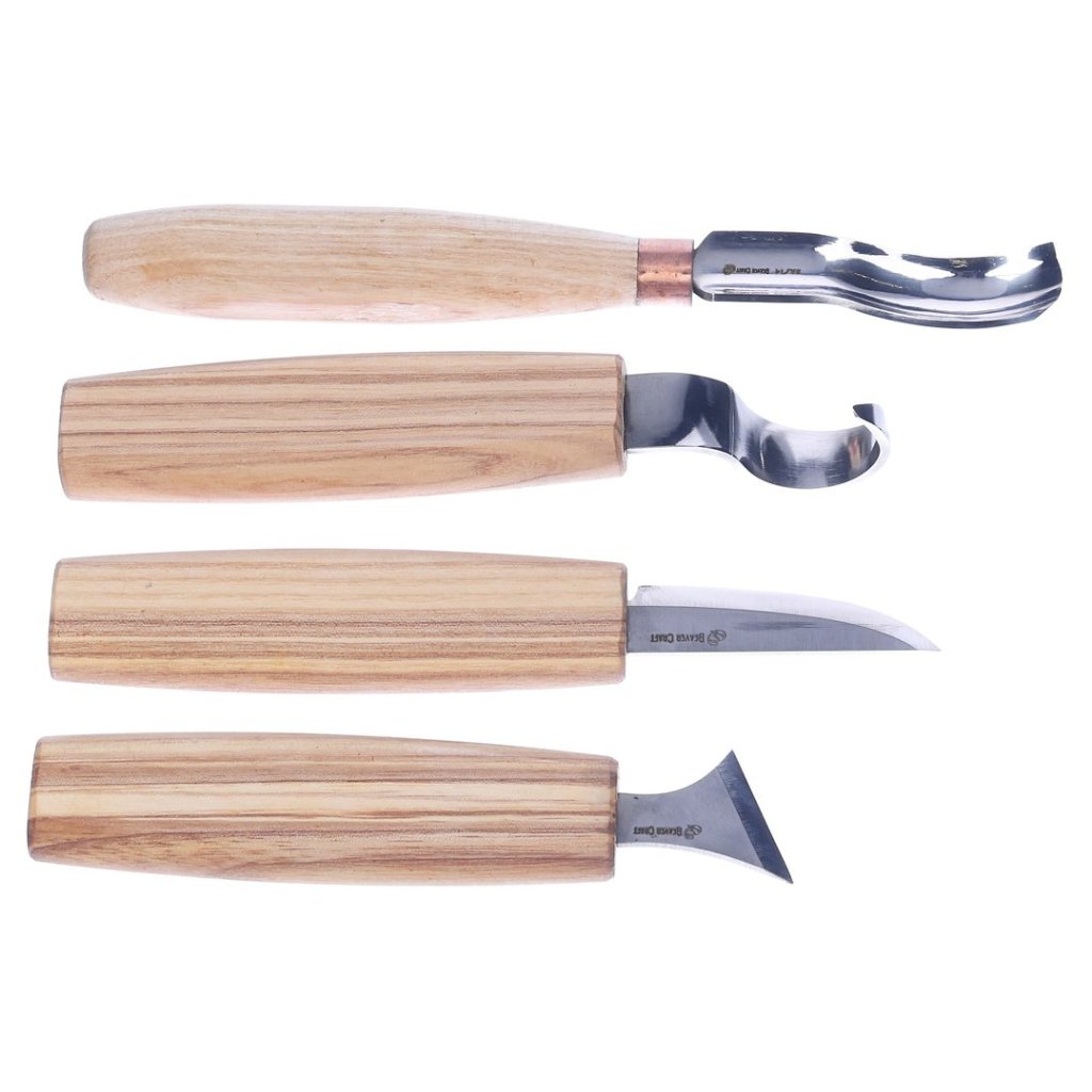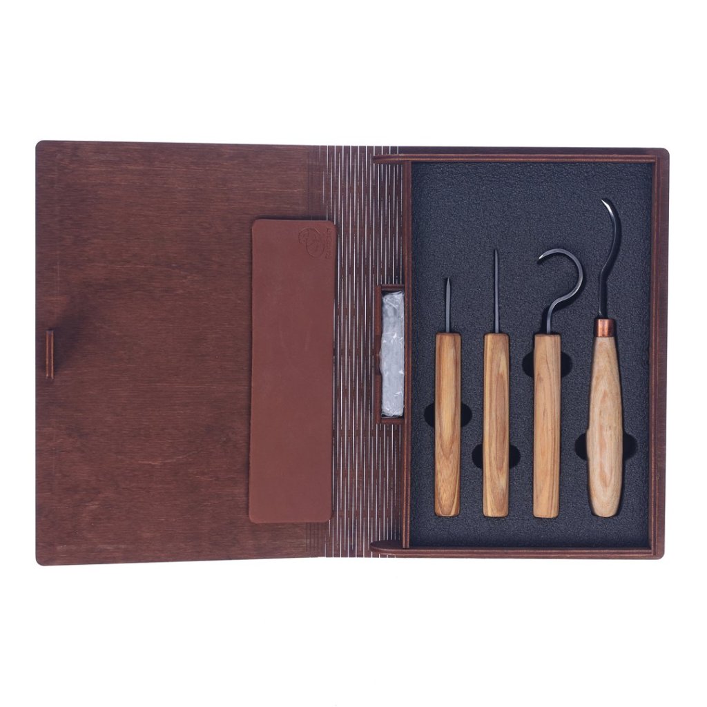 Prémiová sada BEAVERCRAFT k výrobě misek a lžic obsahuje 3 řezbářské nože a lžícovité dláto. Čepele jsou vyrobeny z kvalitní uhlíkové oceli a rukojeti z jasanového dřeva pro maximální komfort při práci. Součástí balení je obtahovací kožený řemen z hovězí kůže určený k ostření a zeleno-šedá brusná pasta ze zrnitostí 5-7 mikronů. Všechny nástroje jsou uloženy ve dřevěném luxusním pouzdře, aby nedošlo k nežádoucímu opotřebení nástrojů. Výrobky obsažené v sadě lze zakoupit i samostatně.