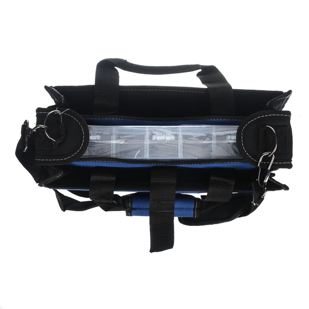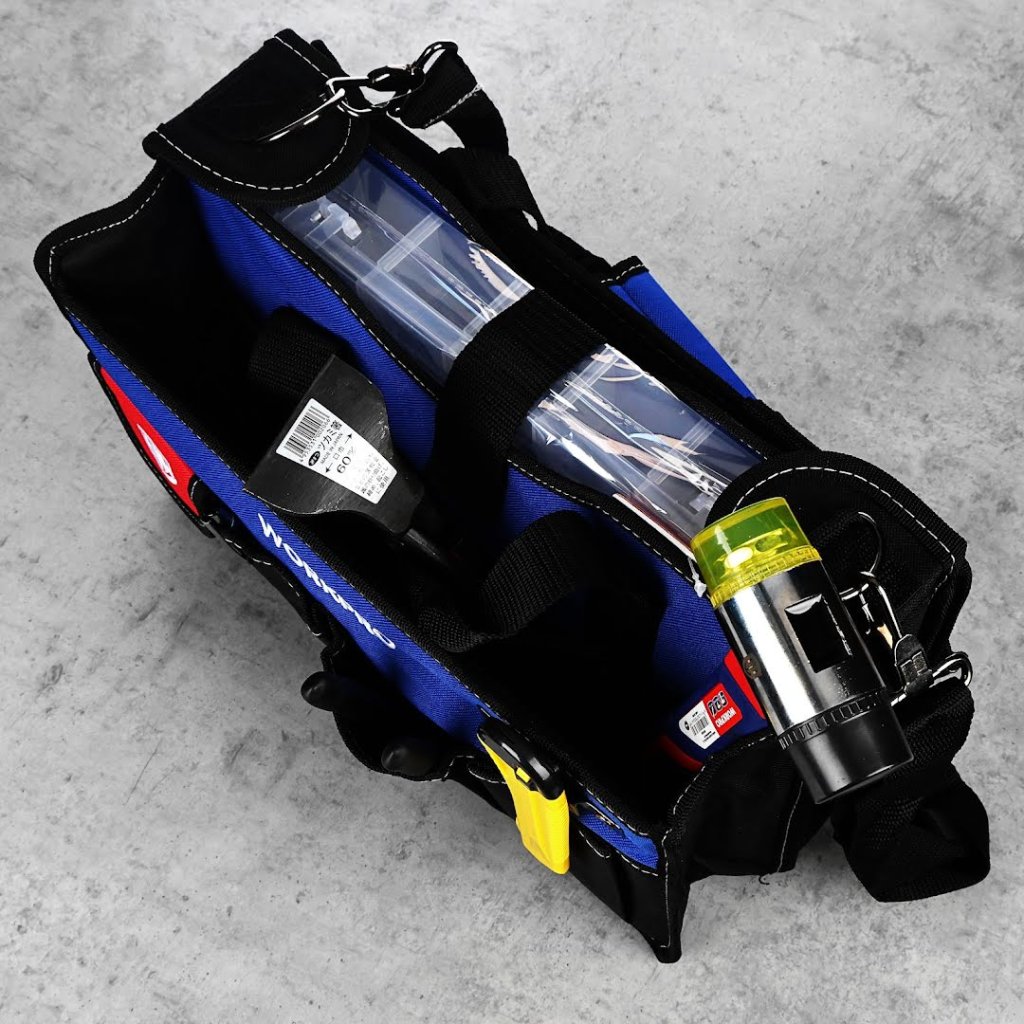 Brašna WORKPRO s 22 kapsami, popruhem přes rameno a dvěma krátkými uchy pro rychlé přemisťování. Velká hloubka a objem brašny umožňuje skladovat a přenášet i větší kusy nářadí jako jsou např. kladiva.