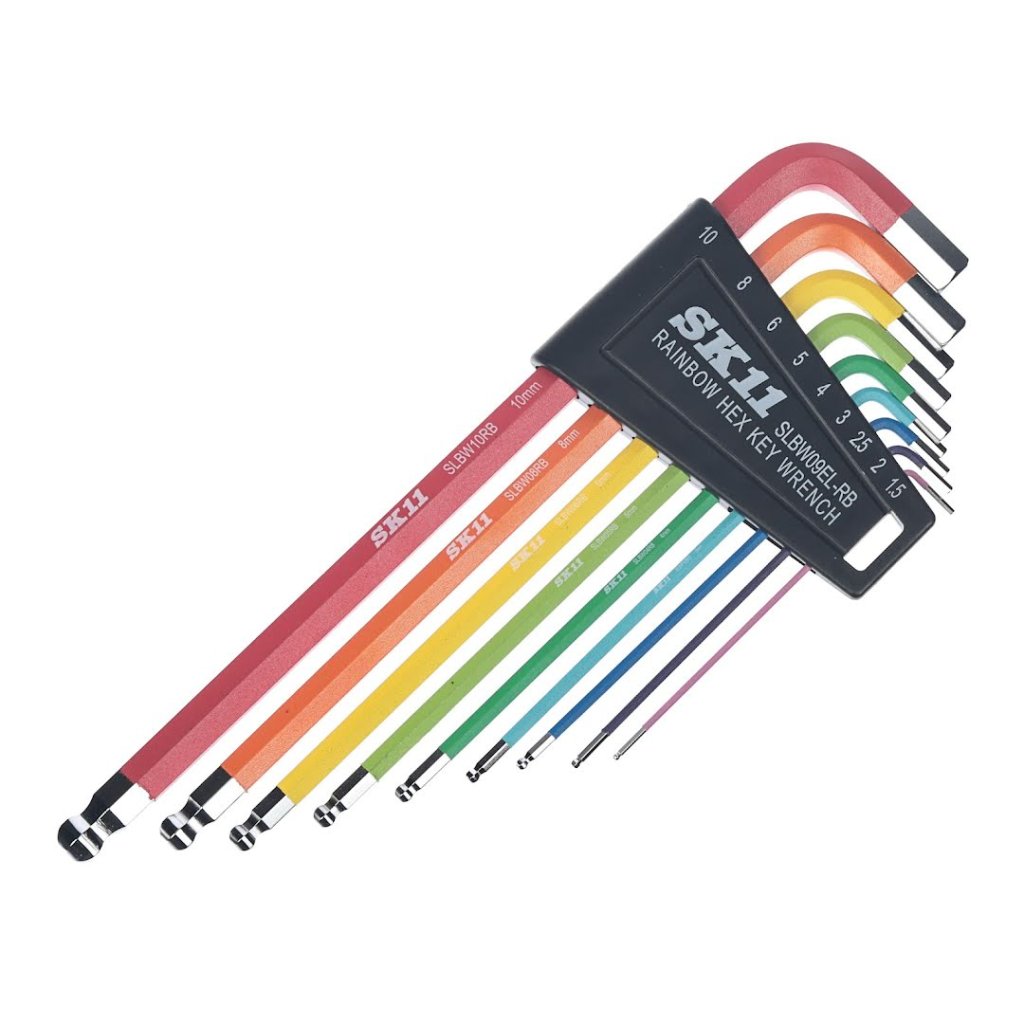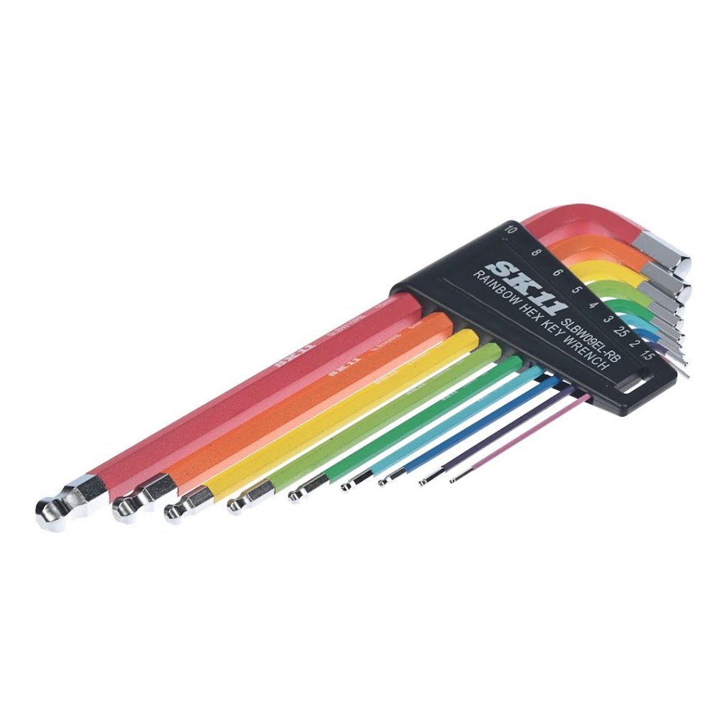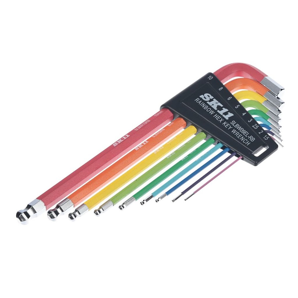 SK11 sada barevných imbusových klíčů s kuličkovým koncem je speciálně navržena pro snadné použití a všestrannost při dosažení šroubů a matic v nepřístupných úhlech, což umožňuje přístup pod úhlem až 25 stupňů. Tato sada obsahuje velikosti 1,5, 2, 2,5, 3, 4, 5, 6, 8 a 10 mm, což pokrývá širokou škálu aplikací od utahování po povolování šroubů a matic s vnitřním šestihranem. Dlouhý design zlepšuje páku a dosah v těsných prostorech. Sada je dodávána v barevném provedení a praktickém skládacím držáku, který usnadňuje přenášení, skladování a výběr potřebného klíče.