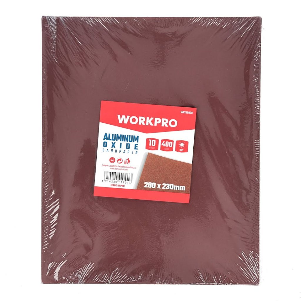 Sada brusných papírů WORKPRO pro ruční broušení dřeva, oceli, nátěrů a tmelů.