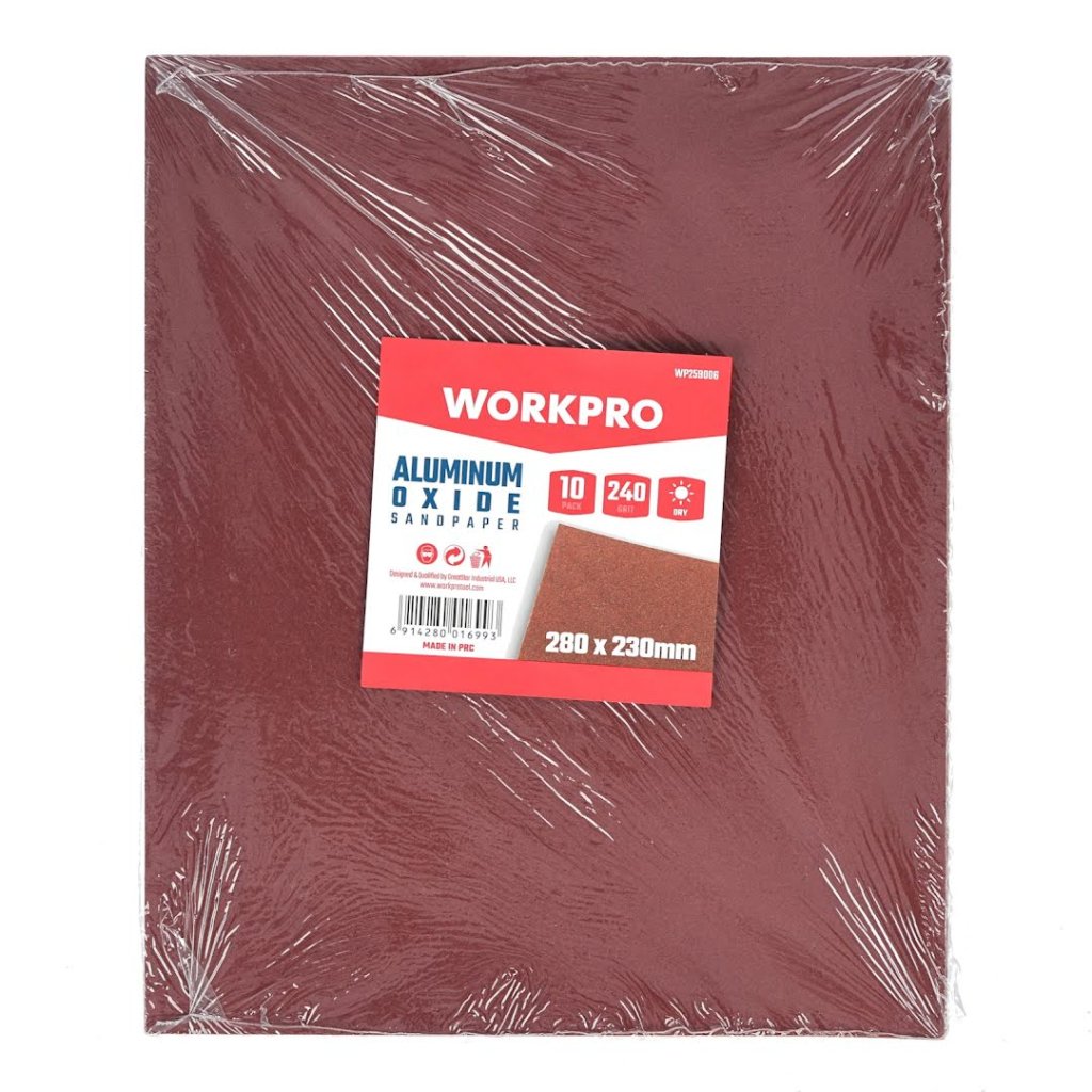 Sada brusných papírů WORKPRO pro ruční broušení dřeva, oceli, nátěrů a tmelů.