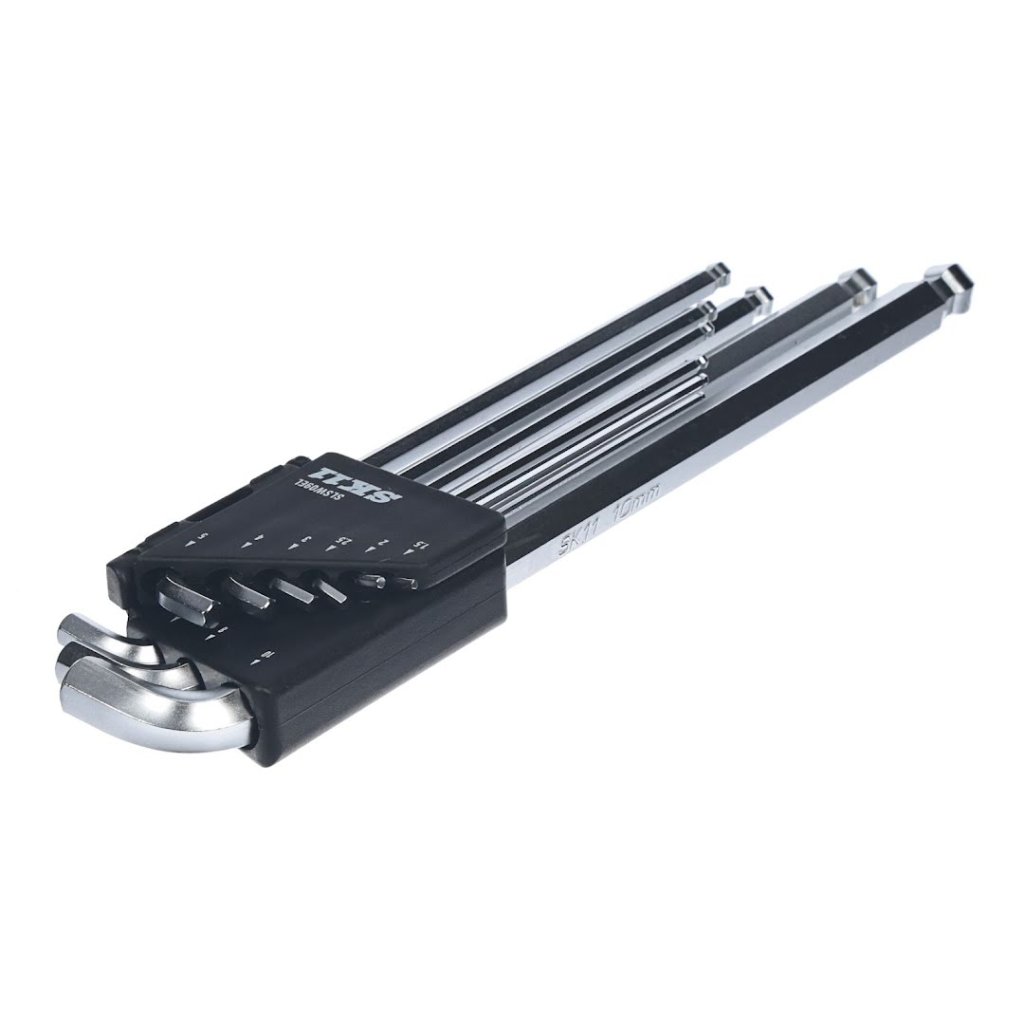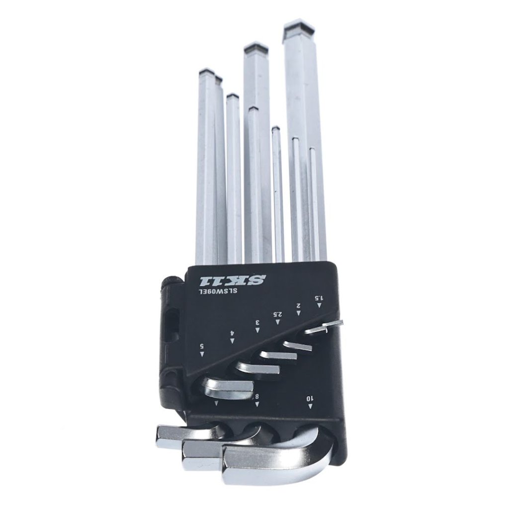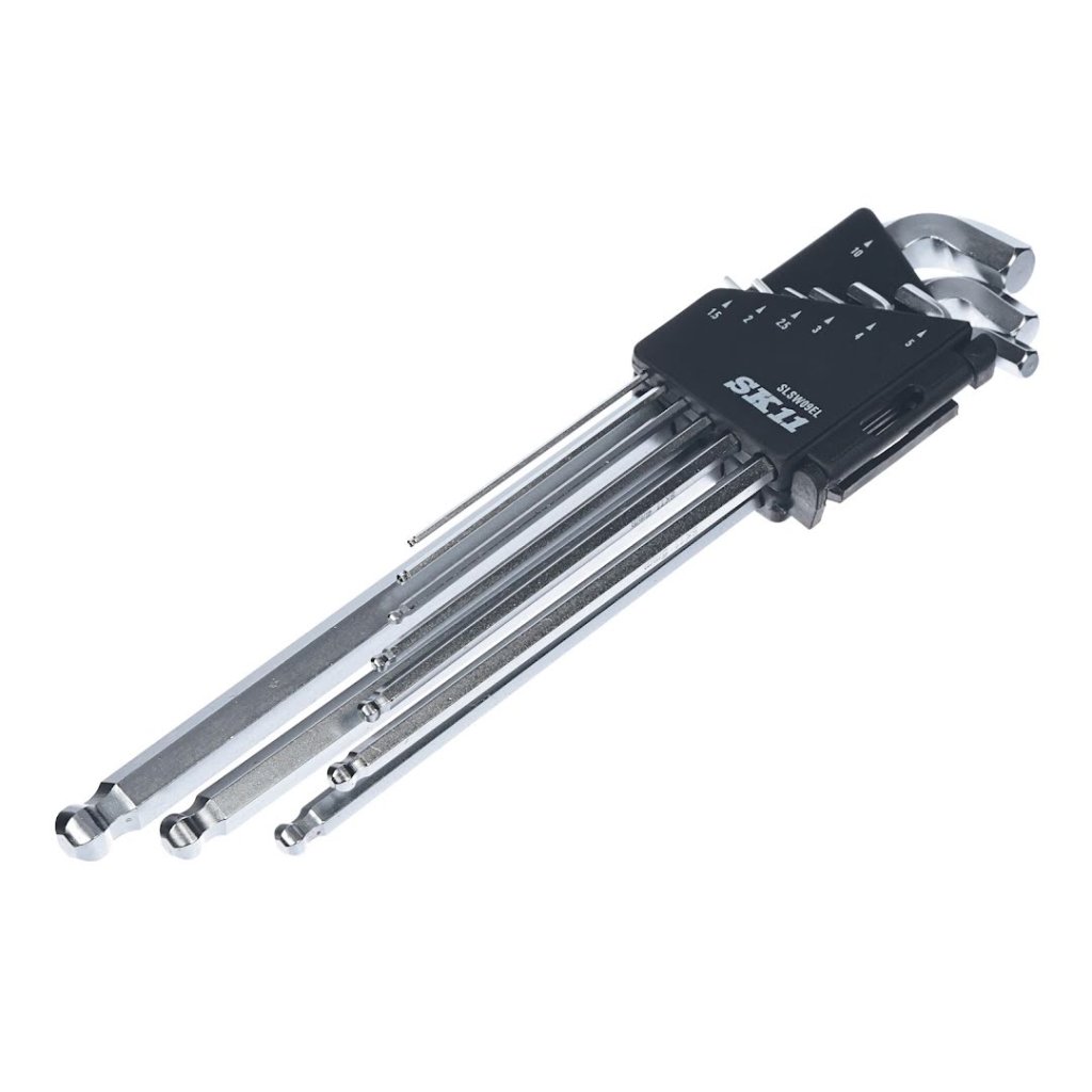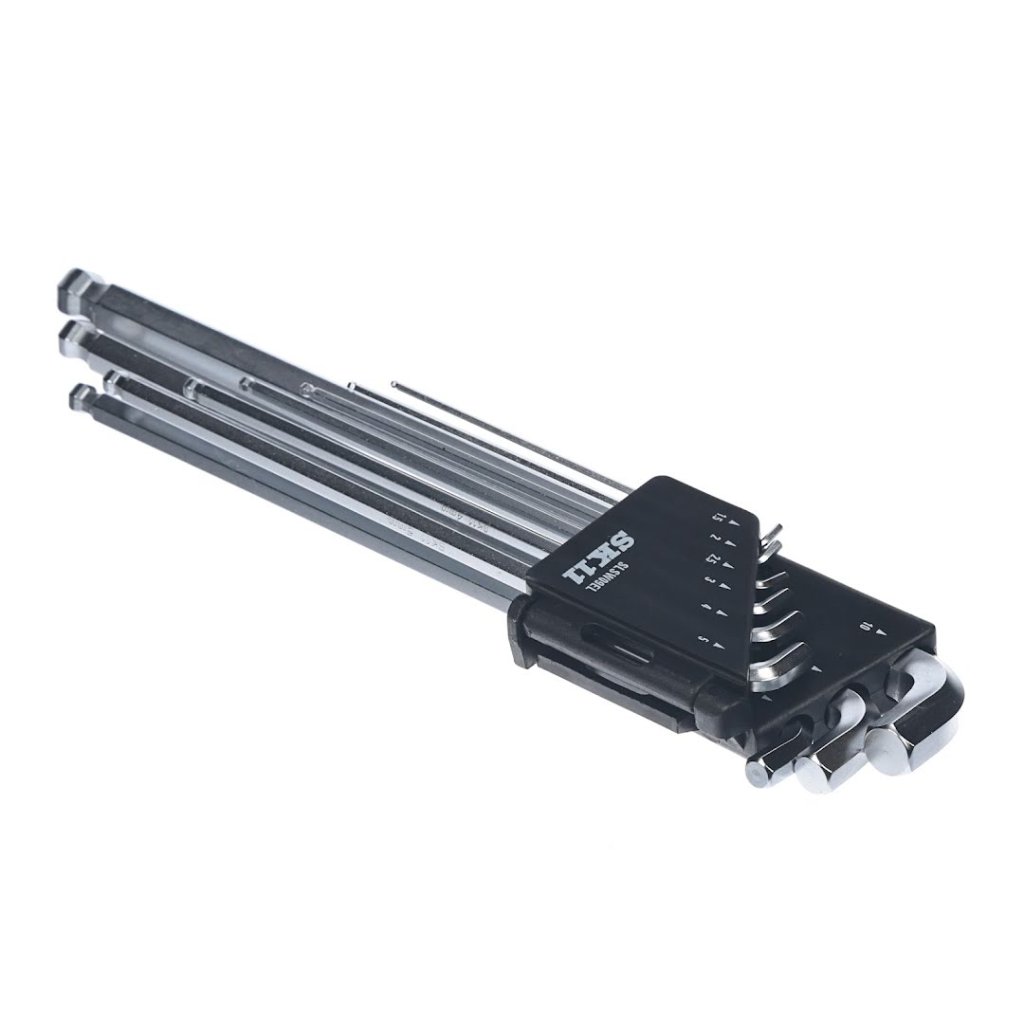 SK11 sada imbusových klíčů s kuličkovými konci, je navržena pro efektivitu a přístupnost při utahování a povolování šroubů s vnitřním šestihranem. Tato sada obsahuje 9 klíčů s kuličkovým koncem, který umožňuje pracovní úhel až 25 stupňů a zkráceným čelem ideálním pro úzké prostory. Prodloužená délka každého klíče zvyšuje páku a dosah, zatímco kompaktní velikost zajišťuje snadné přenášení a skladování. Sada obsahuje velikosti od 1,5 mm až po 10 mm, a je uložena v praktickém pouzdru s vyklápěním pro rychlý přístup a organizaci.