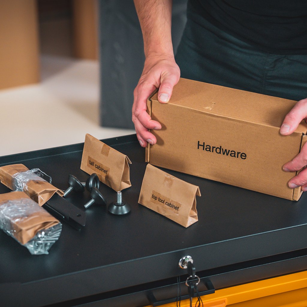 Stěna za stolem slouží jako multifunkční organizér s háčky, lištami a držáky, které umožňují snadno pověsit různé nářadí a příslušenství tak, aby bylo vždy po ruce a přehledně rozmístěné. Skříň nabízí dostatek prostoru pro uložení nářadí, součástek i dalších potřebných věcí, přehledně uspořádaných v různých přihrádkách a policích.
