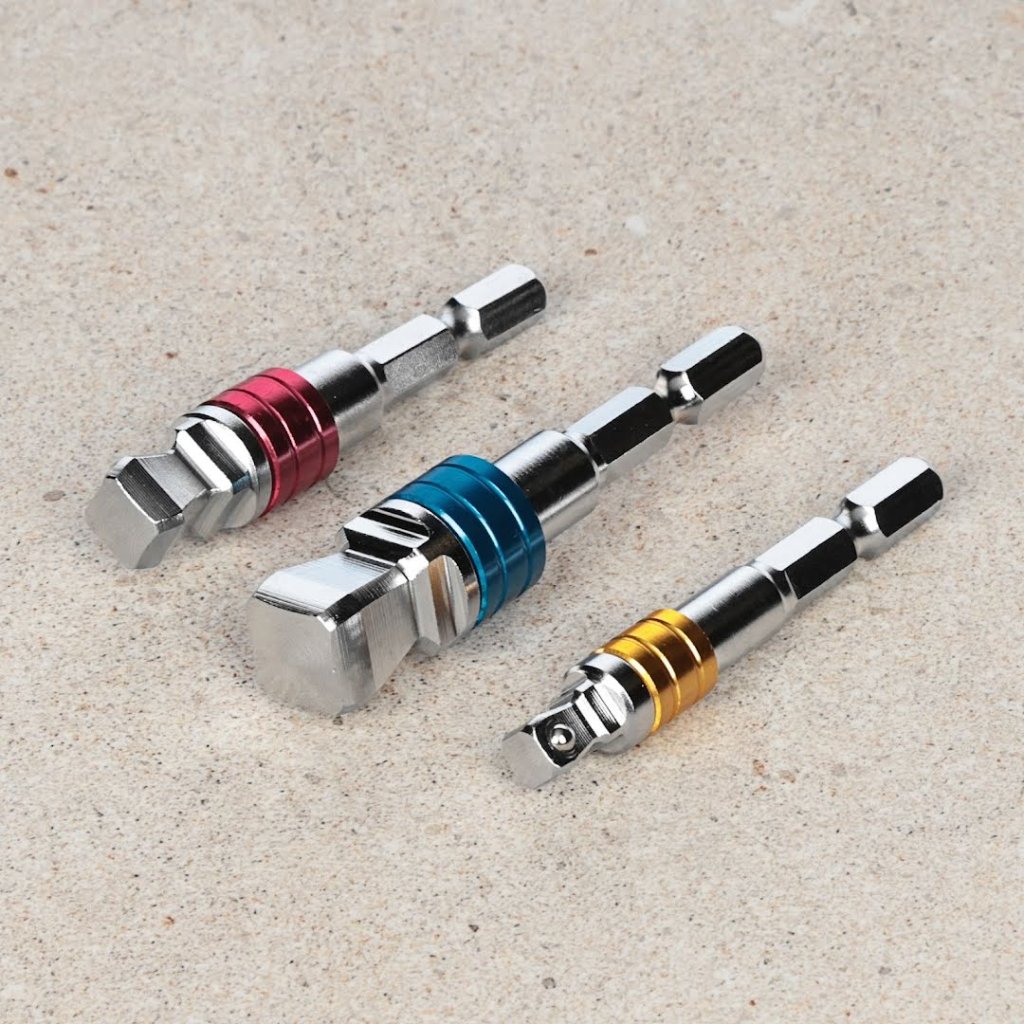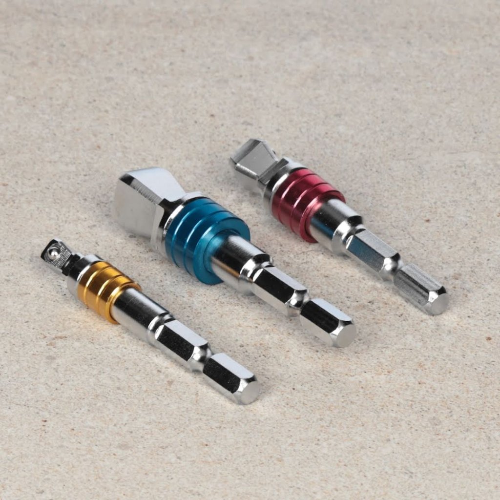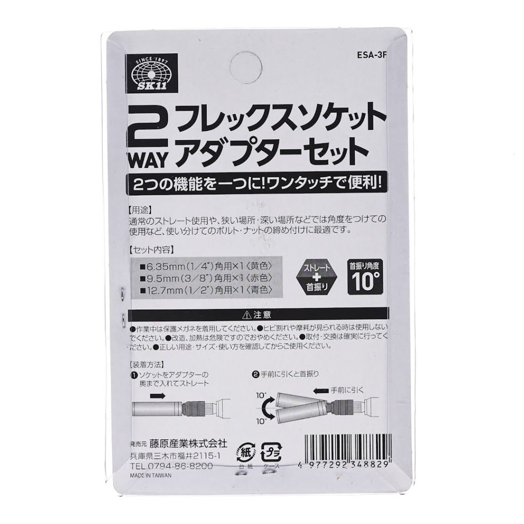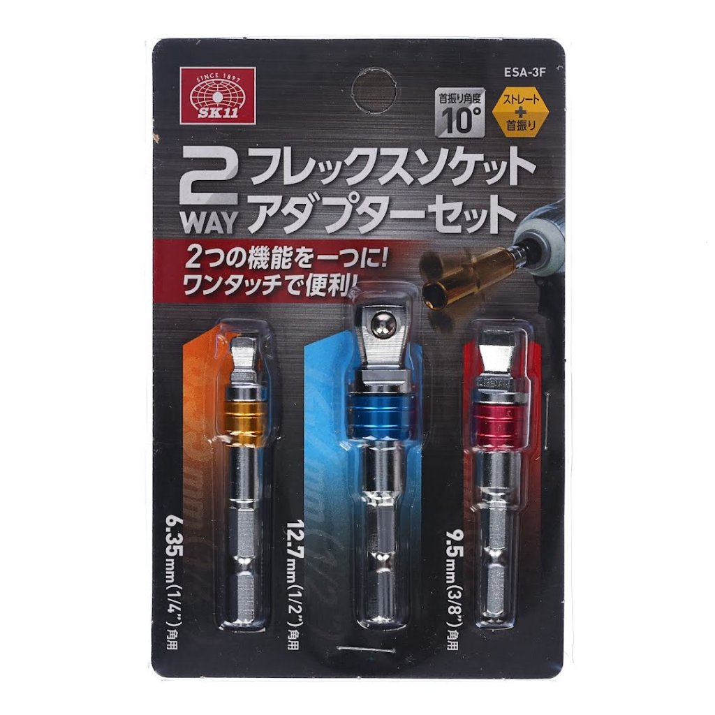 Sada naklápěcích adaptérů pro nástrčné klíče SK11, model ESA-3F, nabízí všestranné řešení pro elektrické nářadí. Navržena pro těsné prostory. Sada zahrnuje tři adaptéry s úhlem naklopení 10 stupňů, které zajišťují maximální flexibilitu. Sada obsahuje pohonné velikosti 6,35 mm, 9,5 mm a 12,7 mm a je kompatibilní s různými značkami nástrčných klíčů.