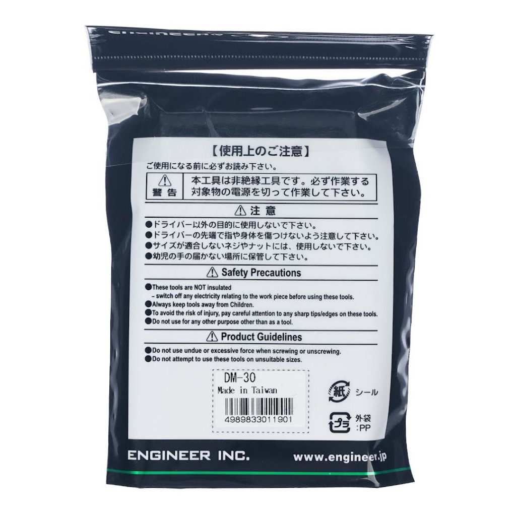 Sada šroubováků ENGINEER, model DM-30, je kompaktní, přenosná sada nářadí pro jemné práce. Tato sada obsahuje šest precizních šroubováků s plochými hroty, které jsou ideální pro použití na hodinkách, fotoaparátech a brýlích. Každý šroubovák má rýhovanou rukojeť pro lepší úchop a kontrolu, což zajišťuje vynikající výkon v úzkých prostorech. Sada je úhledně uložena v kompaktním pouzdře o rozměrech 80x130x20 mm a váží pouze 123 g, což usnadňuje její přenášení a skladování.